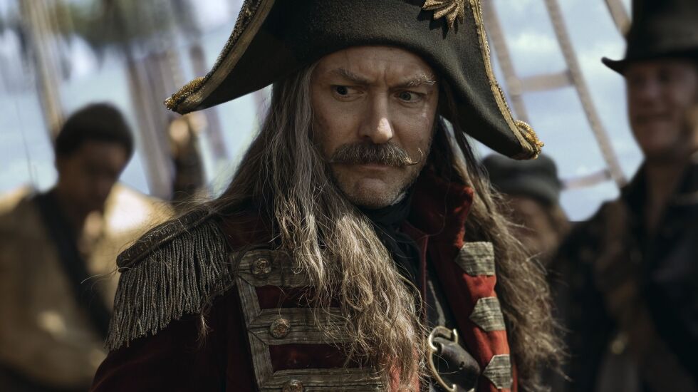 As for mean, cursed ol’ Captain Hook … Jude Law disguises his handsomeness behind a prosthetic nose and some terrible hair, and has a great time hamming it up as the hook-handed villain, who has dozens of Rules of the Ship (“No one shall say the boy’s name. … No whistling. … No clocks”) and sounds like Honey Bunny in “Pulp Fiction” when he says of the children, “Execute every last one of them!” Good thing we have Jim Gaffigan as Mr. Smee along for the ride, providing some welcome comic relief.