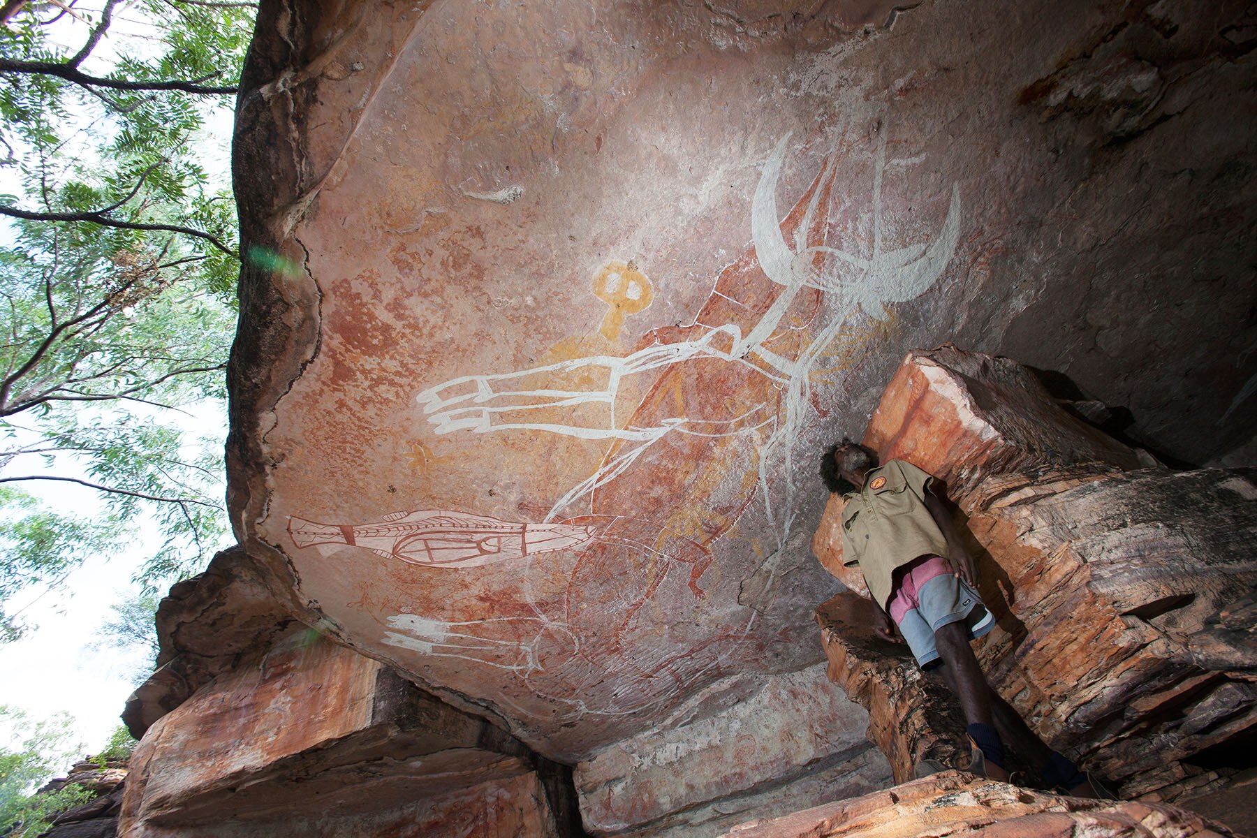 The significance of first contact with the large beasts is reflected in rock art paintings of Djabidjbakalloi, where life-size images of buffalo appear alongside images of boats, horses and guns, sites which Mr Hancock was able to photograph thanks to Warddeken IPA rangers.