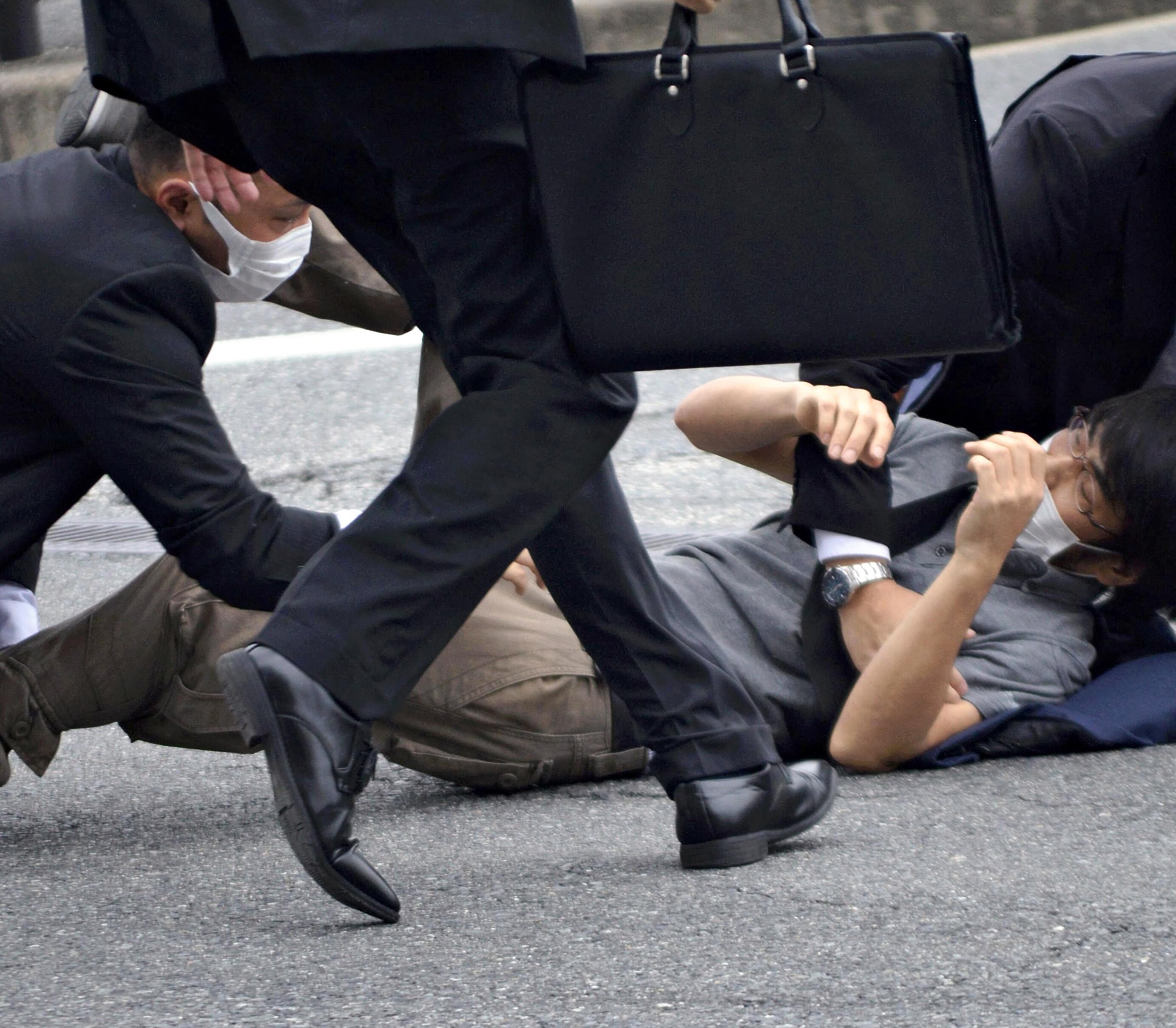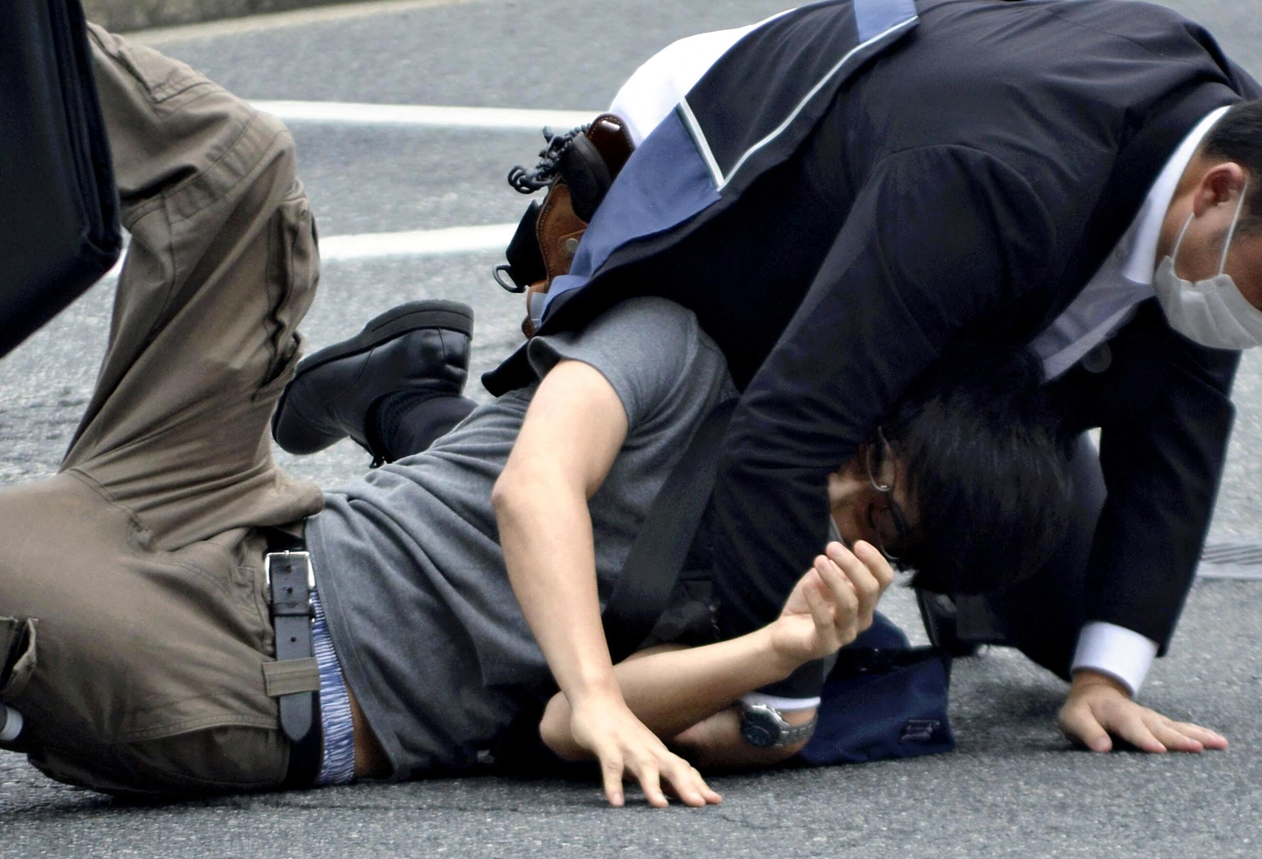 The suspect was holding the alleged weapon when he was first approached. (The Asahi Shimbun via Getty Images) Reinforcements then came to stop the suspect leaving the scene. (Getty: The Asahi Shimbun) The suspect was tackled to the ground by officials after dropping the alleged weapon. (AFP: The Yomiuri Shimbun) Authorities pinned the suspect down. (AFP: Takashi Yamazaki/The Yomiuri Shimbum) The suspect was quickly taken into custody. (AFP: Takashi Yamazaki/The Yomiuri Shimbum)