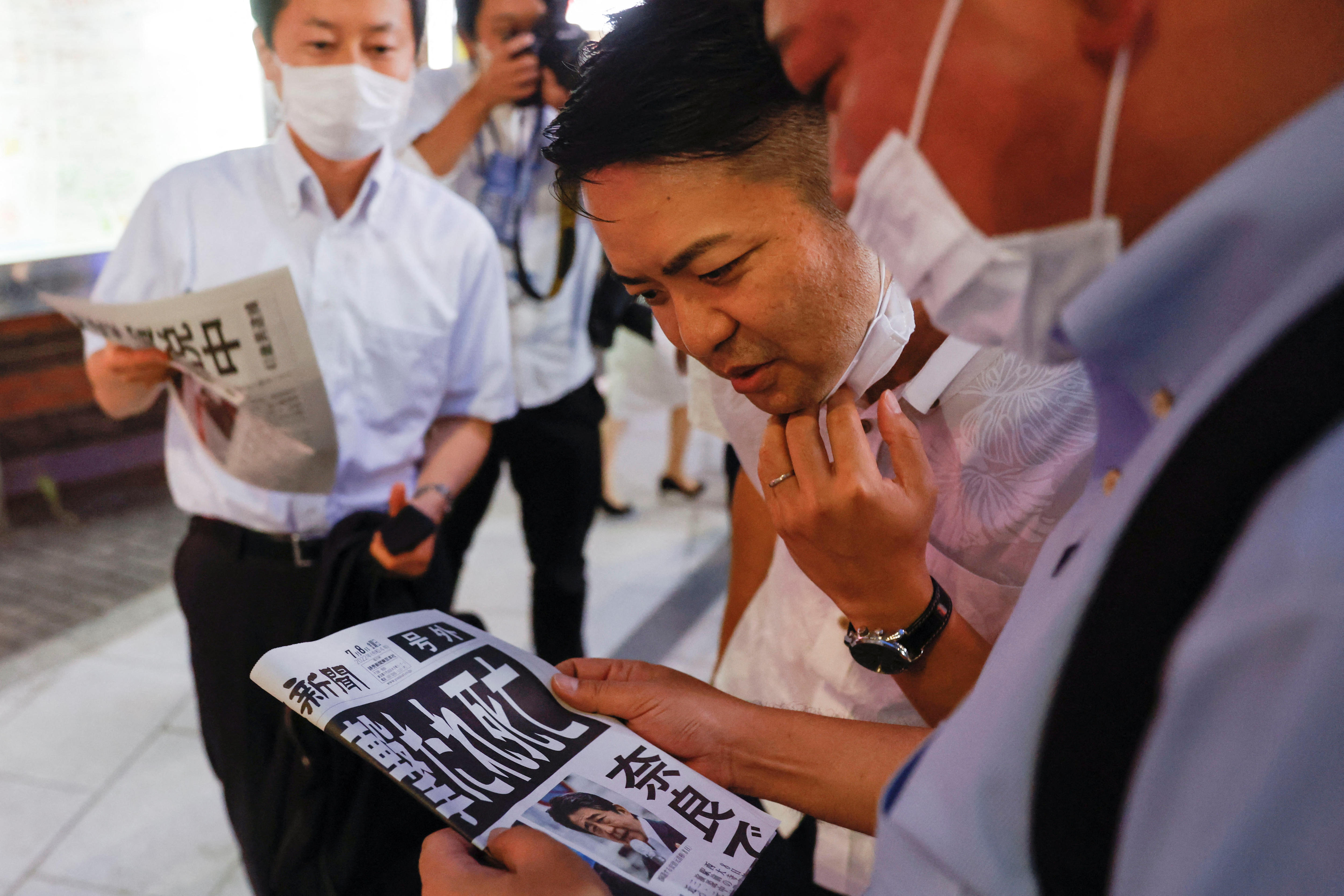 People in Tokyo read a special edition of the Yomiuri Shimbun newspaper reporting the death of Shinzo Abe. (Reuters: Kim Kyung-Hoon)