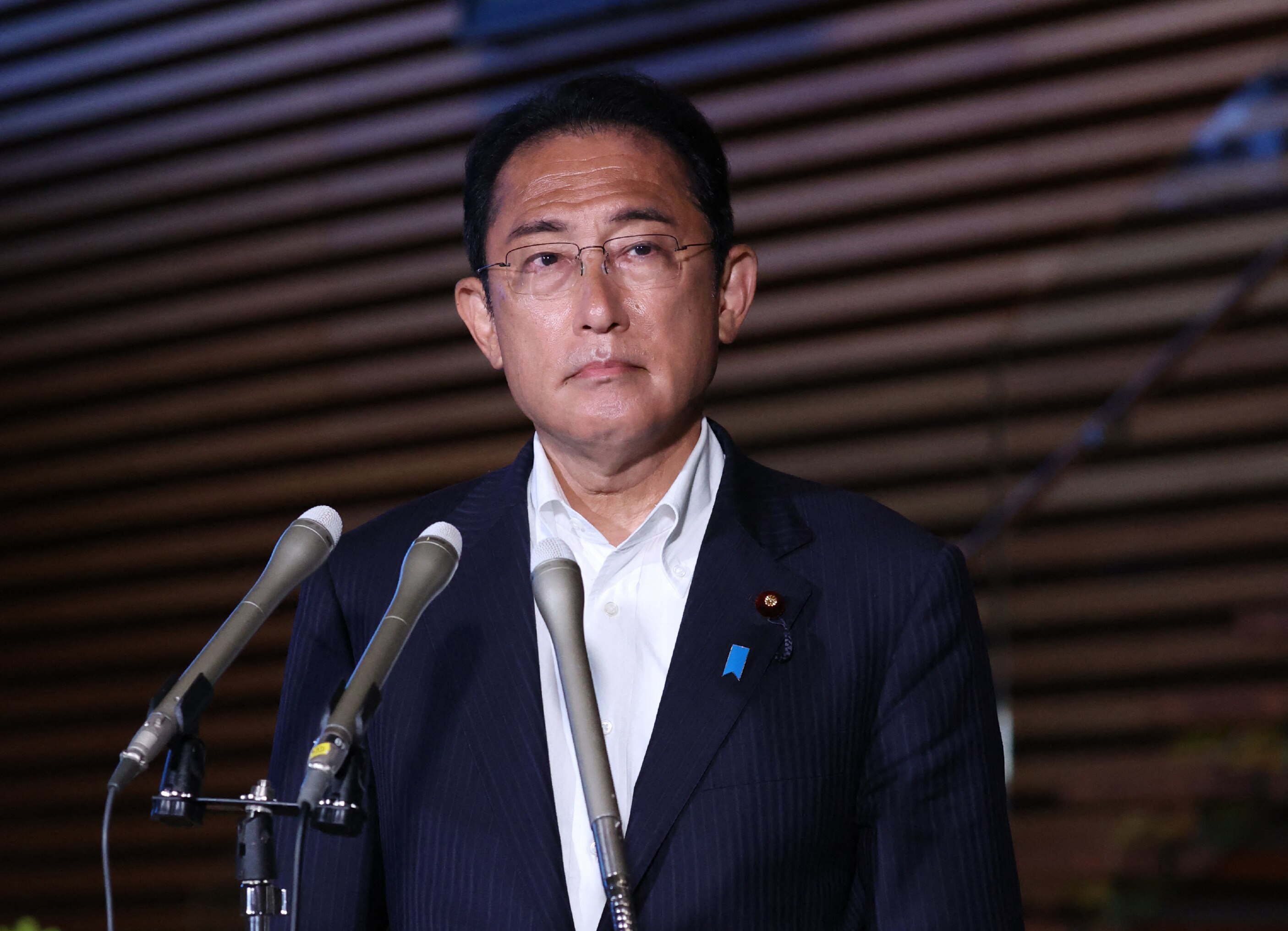 Prime Minister Fumio Kishida spoke to media about Shinzo Abe from his office in Tokyo. (AFP: Masanori Genko/The Yomiuri Shimbun)