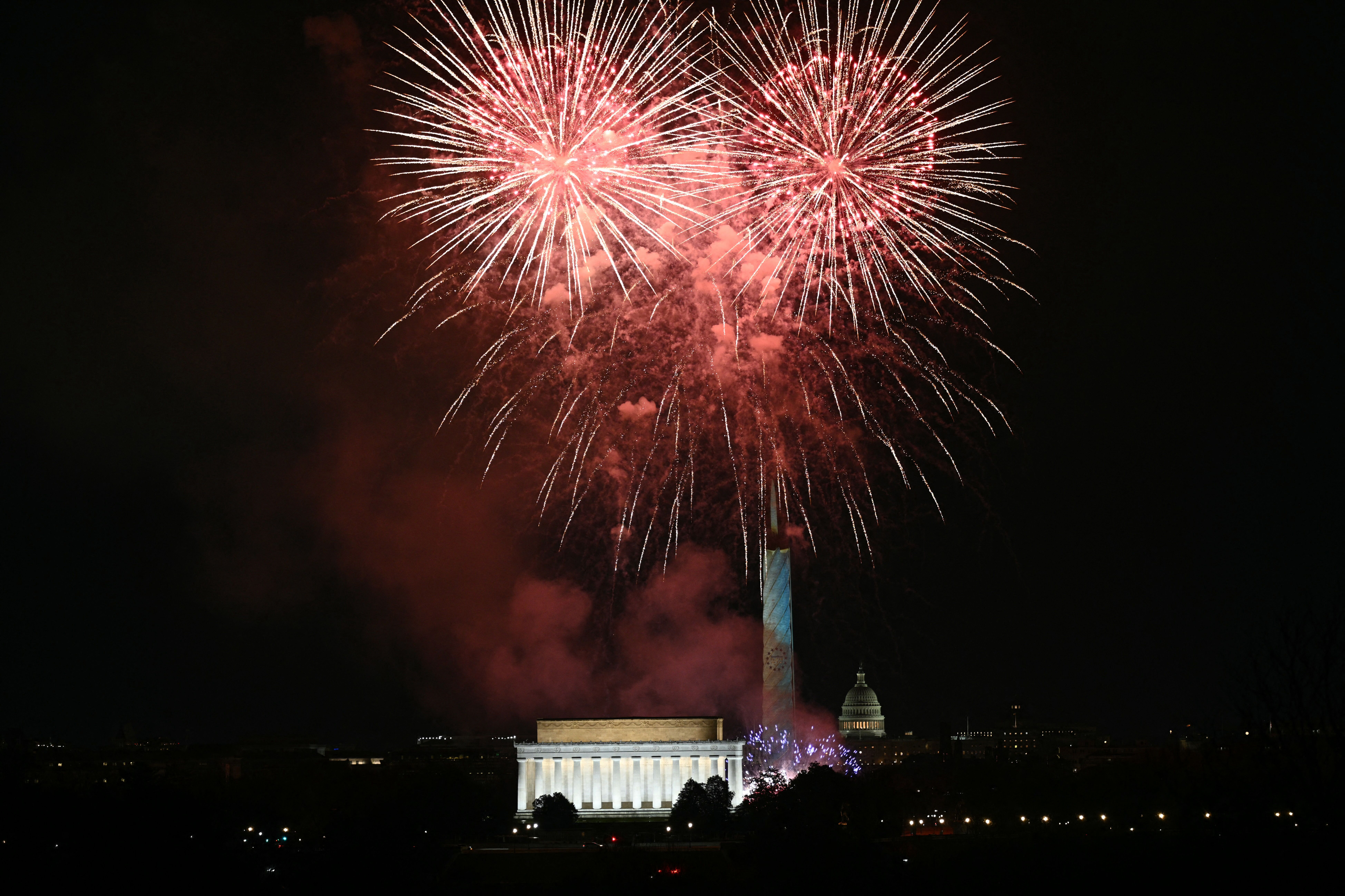 Fireworks explode over the Lincoln Memorial and the Washington Monument in Washington, D.C., on Jan. 1. Photo: Brendan Smialowski/AFP via Getty Images