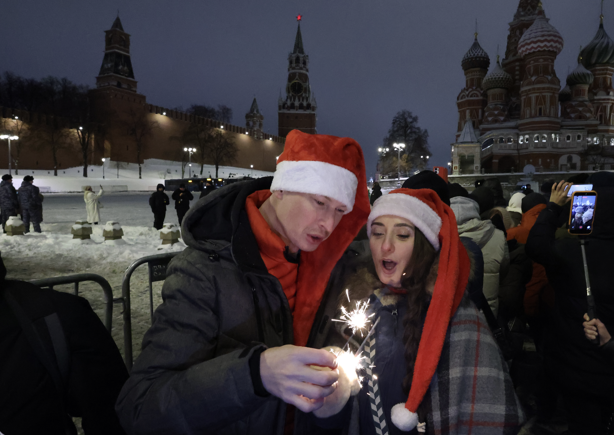 New Year's Eve celebrations on Dec. 31 next to Red Square, in Moscow, Russia, which is closed to visitors through 10am on Jan. 1 local time. Photo: Contributor/Getty Images