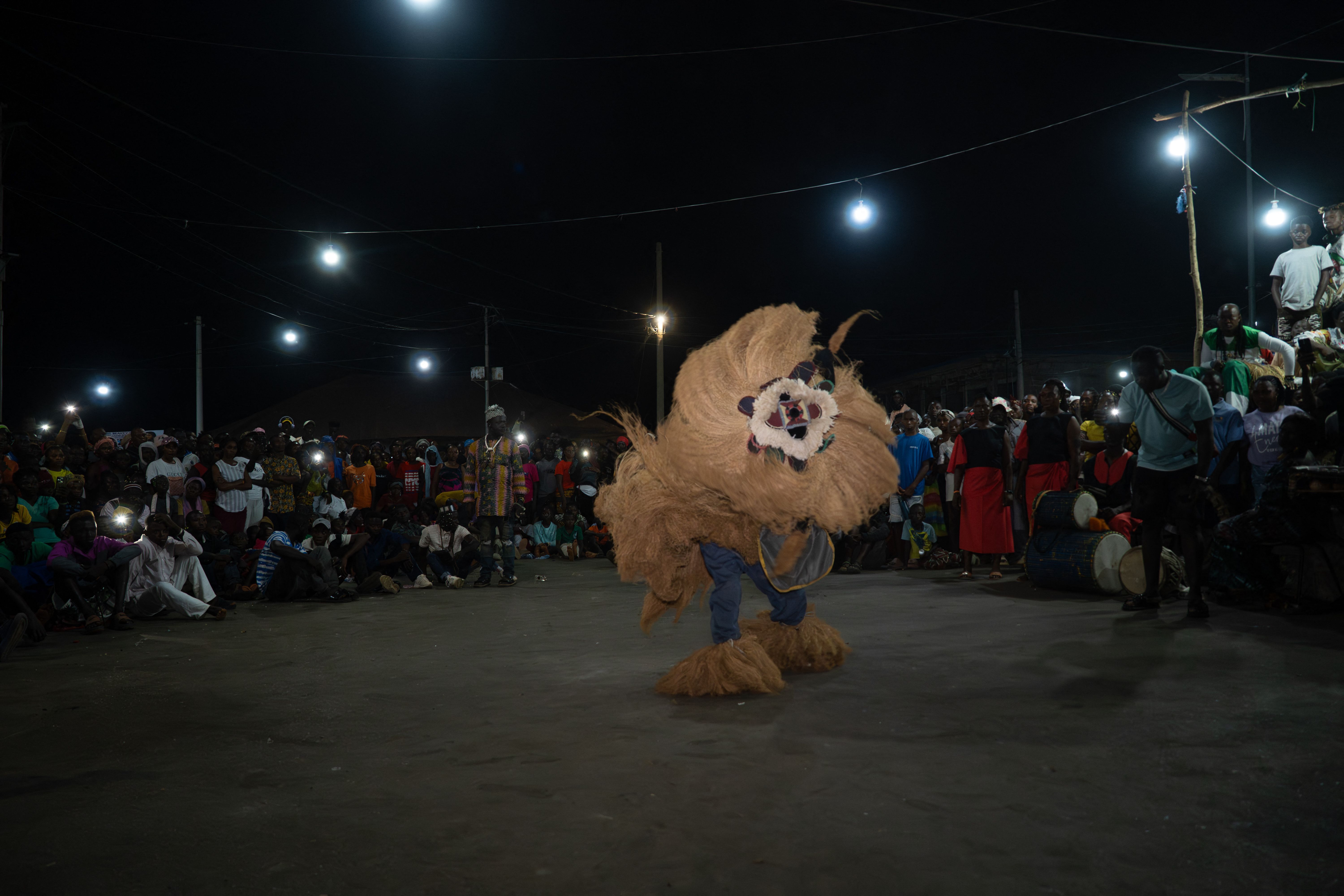 A dance troop member dressed in a masquerade costume dances in front of a crowd during the Sierra Leone New Year's Cultural Festival in Kabala on Jan. 1. Photo: Gemma Bonfiglioli/AFP via Getty Images