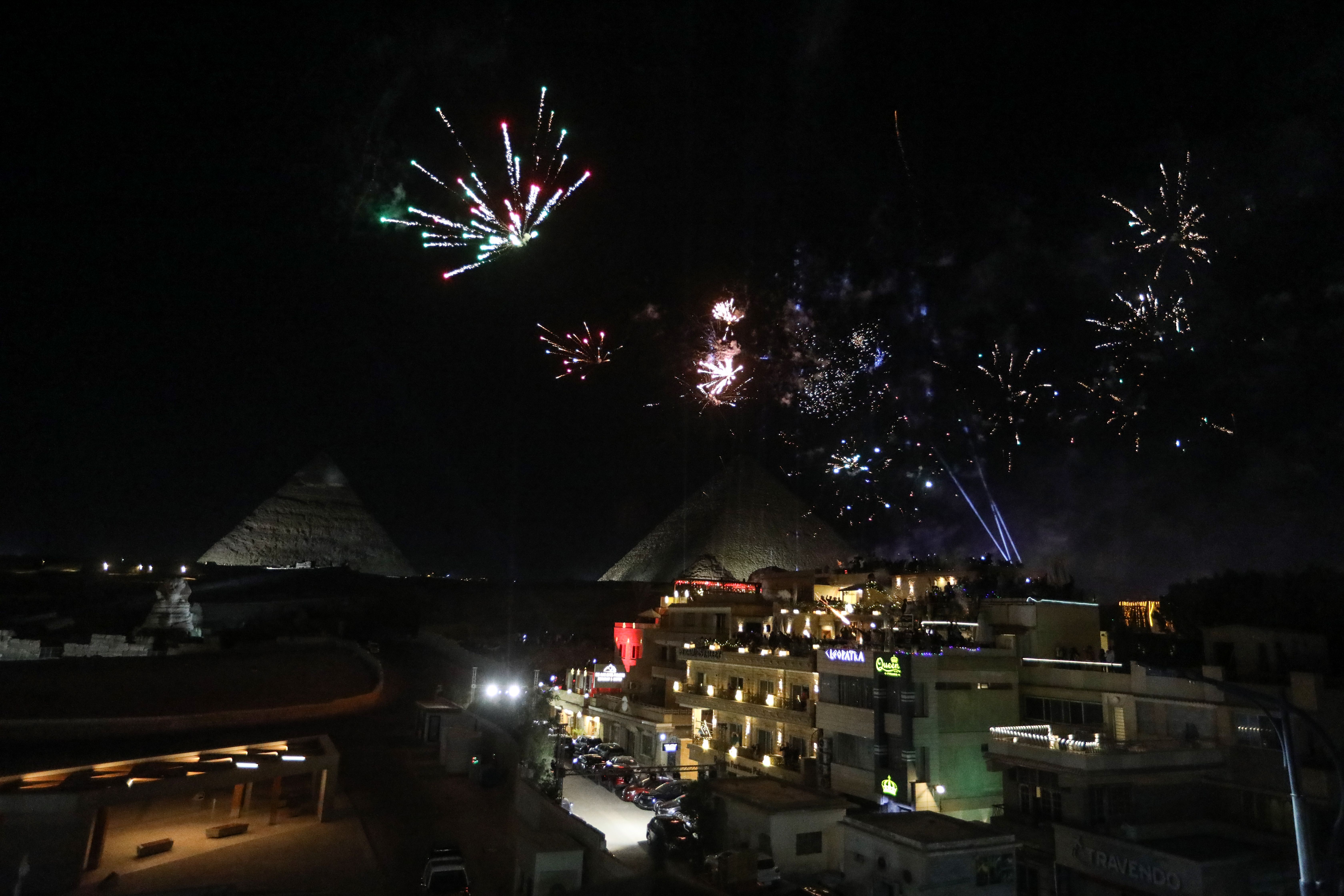 Fireworks celebrations over Egypt's ancient pyramids at night in Giza on Jan. 1. Photo: Ahmad Hasaballah/Getty Images