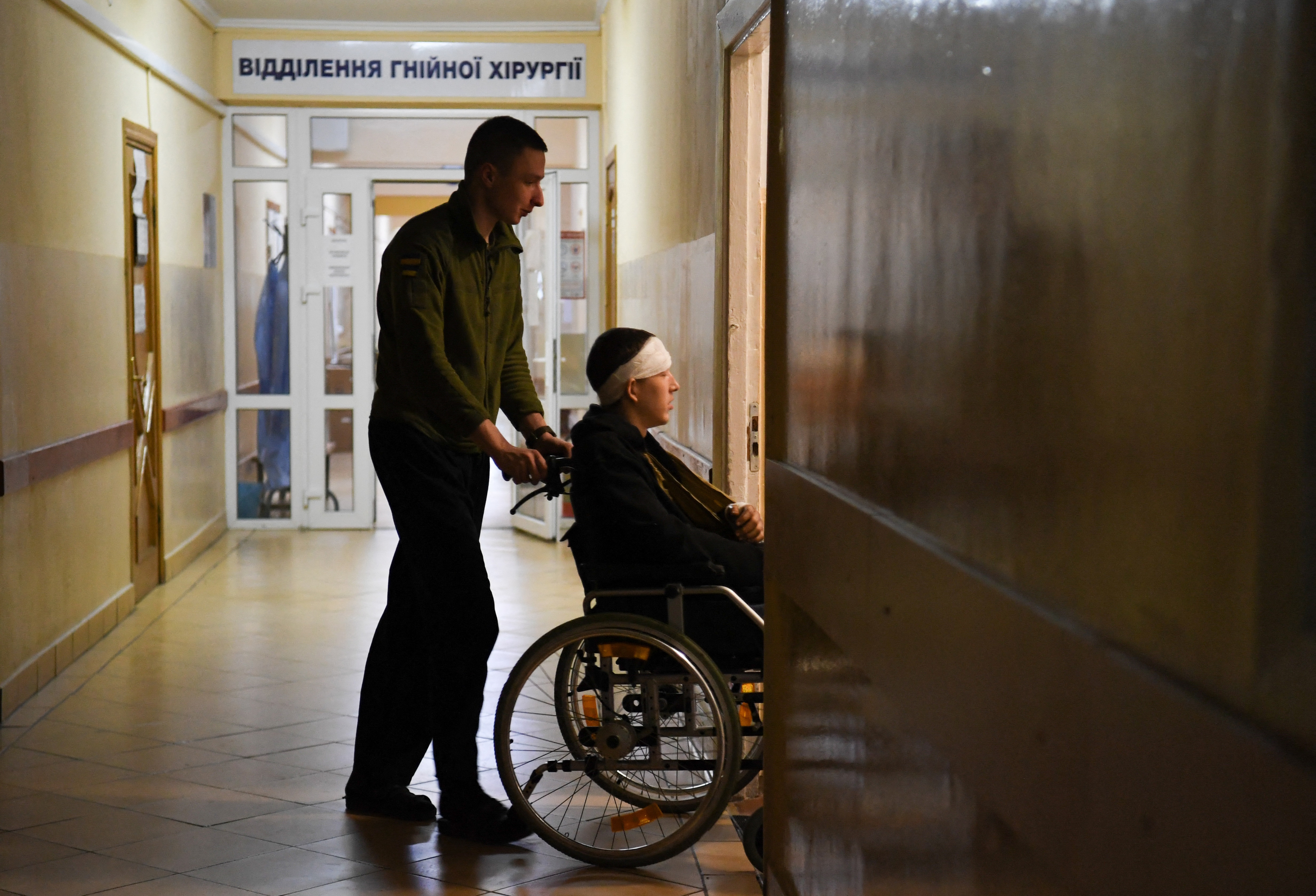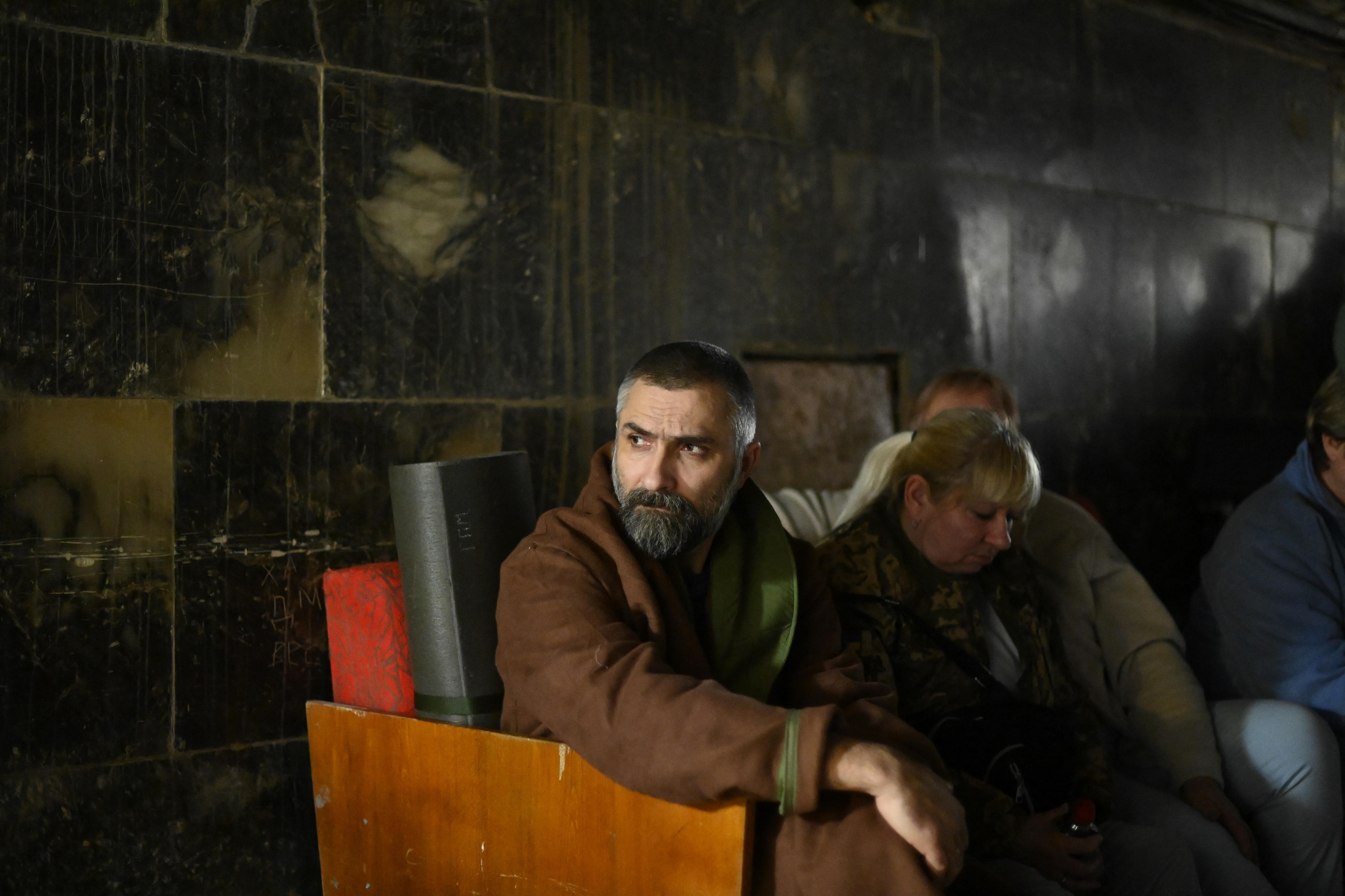 An injured Ukrainian soldier able to walk takes cover underground while sirens are heard outside a military hospital in Lviv. (Daniel LEAL / AFP)