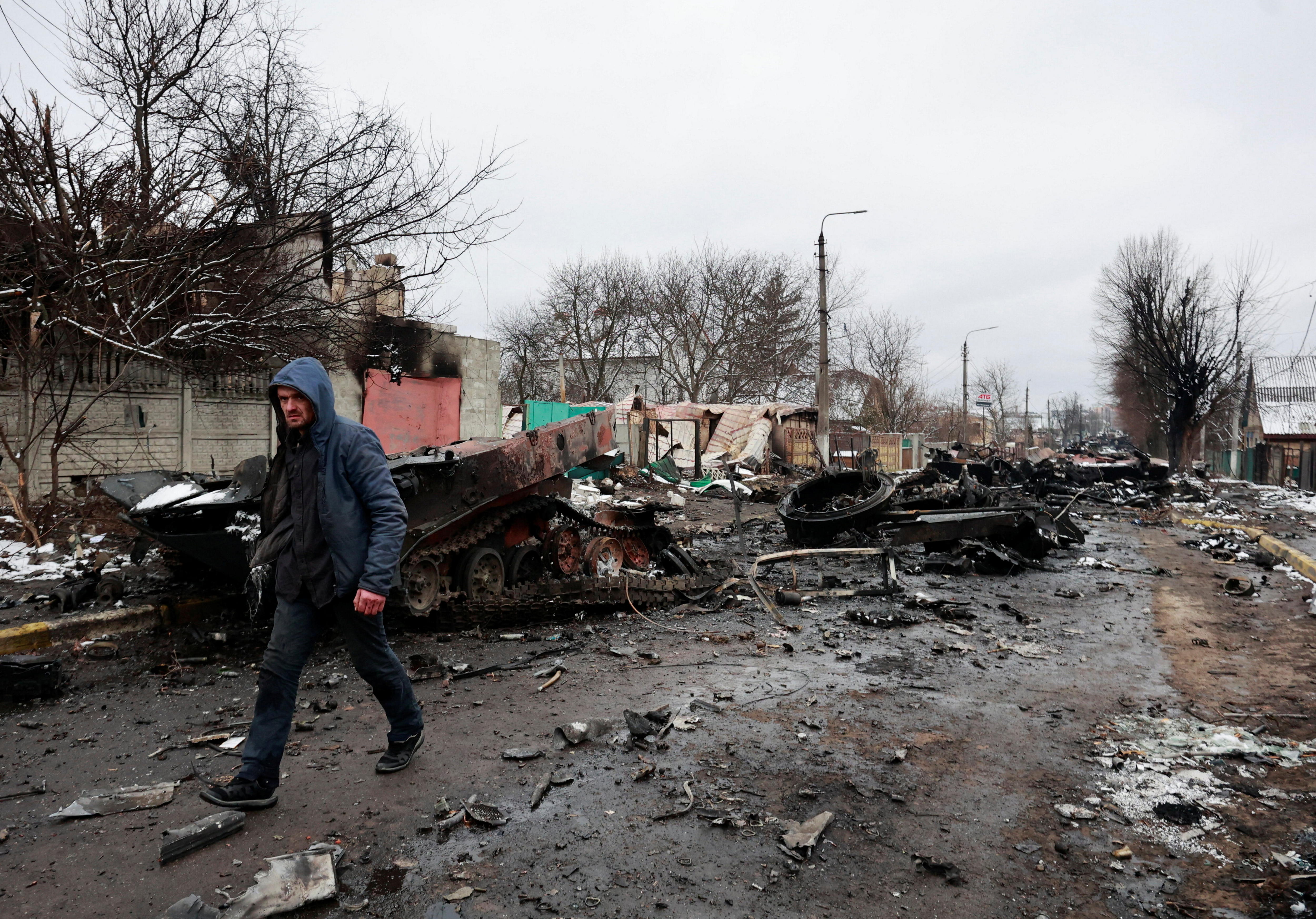Smoke and flames are seen inside a damaged gym following shelling in Kyiv, Ukraine on Wednesday. (AP: Efrem Lukatsky) A woman walks past a destroyed military vehicle in the town of Bucha in the Kyiv region. (Reuters: Serhii Nuzhnenko) A man walks past destroyed military vehicles on a street in the town of Bucha in the Kyiv region. (Reuters: Serhii Nuzhnenko) A burned car sits among the ruins following Russian attacks in Zhytomyr, Ukraine. (Getty/State Emergency Service of Ukraine) Russian attacks have destroyed building in Zhytomyr, Ukraine. (Getty/State Emergency Service of Ukraine) A reception centre inside Suchodolski Palace, attached to the Dorohusk border crossing between Ukraine and Poland, is welcoming Ukrainians and helping them on their way. Among those being cared for are Christina Gorieva, 4, and her brother Kyrylo, 17. Their father stayed in Ukraine to fight. (ABC News: Brad Esposito) Ukrainians who have fled their country wait outside a reception centre attached to the Dorohusk border crossing between Ukraine and Poland. (ABC News: Brendan Esposito) A man shows a portrait of singer-songwriter John Lennon inside the damaged local city hall of Kharkiv, which was hit by a Russian missile strike. (Sergey BOBOK / AFP) Emergency crew near a television tower in Kyiv, after a Russian strike hit the area. (Ukrainian State Emergency Service/Handout via REUTERS) Hospital staff take cover underground while sirens are heard outside, in a military hospital in Lviv. (Daniel LEAL / AFP) A soldier pushes a wheelchair with an injured Ukrainian soldier in a military hospital in Lviv. (Daniel LEAL / AFP) At the Dorohusk border crossing, buses of Ukrainians make their way into Poland and to safety. (ABC News: Brendan Esposito) An armed man stands near a barricade during an air raid alarm in Maidan Square, in Kyiv. (AP Photo/Vadim Ghirda) People look at the gutted remains of Russian military vehicles on a road in the town of Bucha, close to the capital Kyiv. (AP Photo/Serhii Nuzhnenko) Olha Kotovska, a Ukrainian school administrator overseeing children who have fled fighting, during their stay in Lviv. (ABC News: Tom Joyner) Pro-Russian troops in uniforms without insignia gather in the separatist-controlled settlement of Mykolaivka (Nikolaevka), in the Donetsk region. (REUTERS/Alexander Ermochenko)