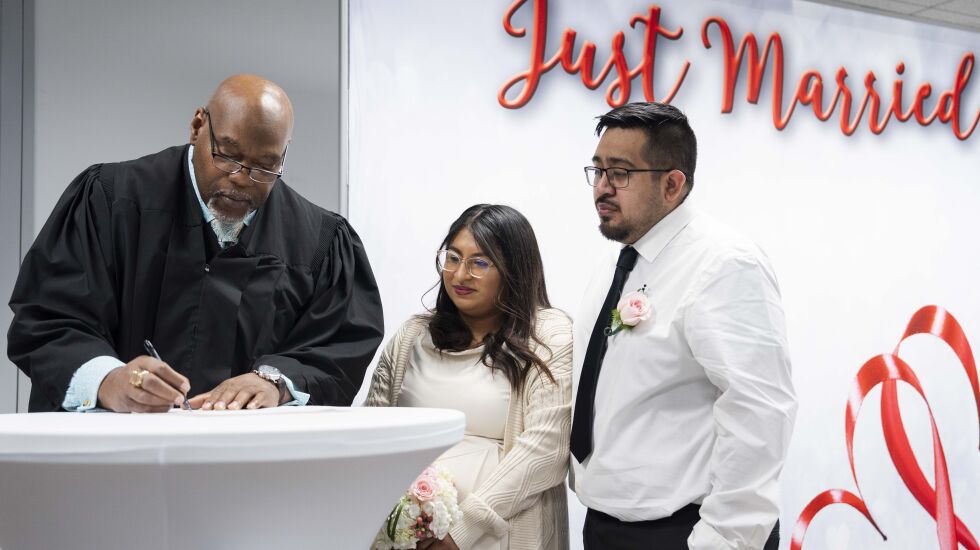 With tears in their eyes and grins on their faces, Arroyo and Rodriguez were married in under five minutes in front of their family, TV cameras and reporters at the Cook County clerk’s office in the Loop. The ceremony was officiated by Travis Richardson, a former Cook County judge and now chief legal counsel for the clerk’s office.