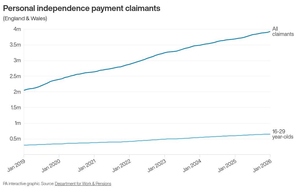 Some 3.93 million people in England and Wales were claiming personal independence payments in January 2026, according to data published on Tuesday by the Department for Work & Pensions (DWP).