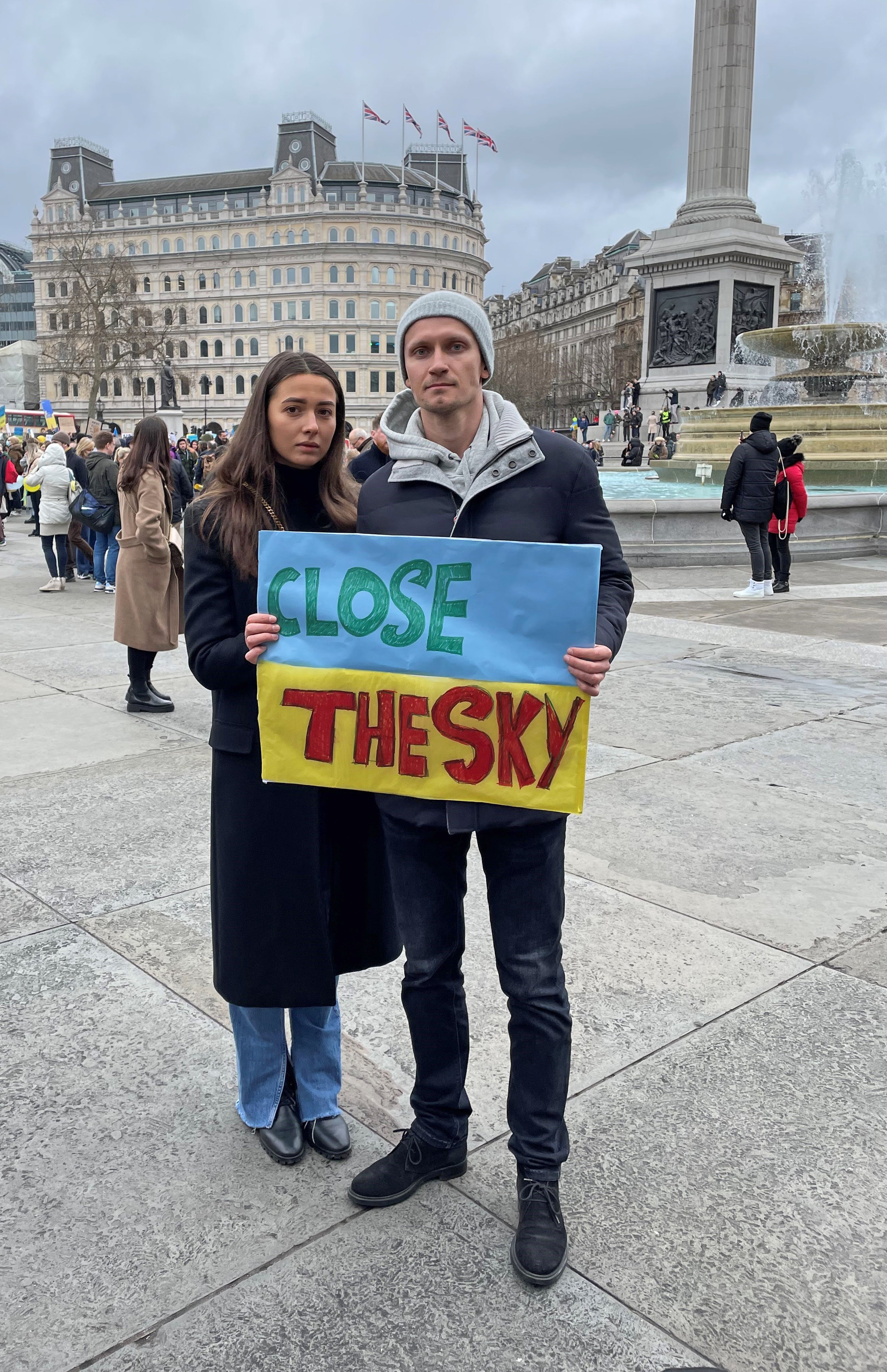 Volodymyr Shevetovskyy, 31, and his girlfriend Nadiia Soshenko, 27, from Kyiv, said they were grateful for support from western countries but called for a no-fly zone to be imposed over Ukraine.