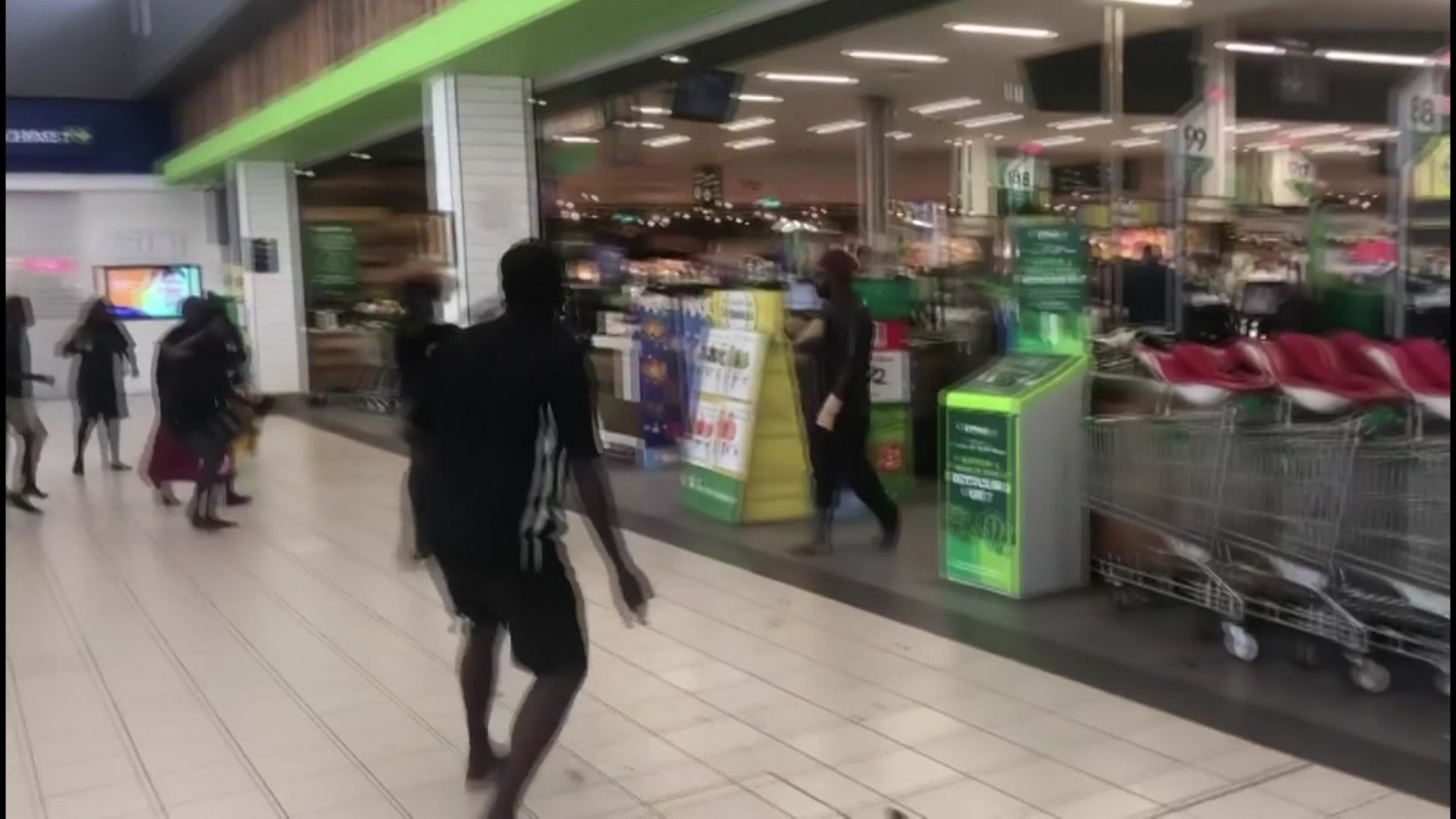 One person can be seen jumping the counter of a coffee shop and arming themselves with a knife, before running towards the supermarket.