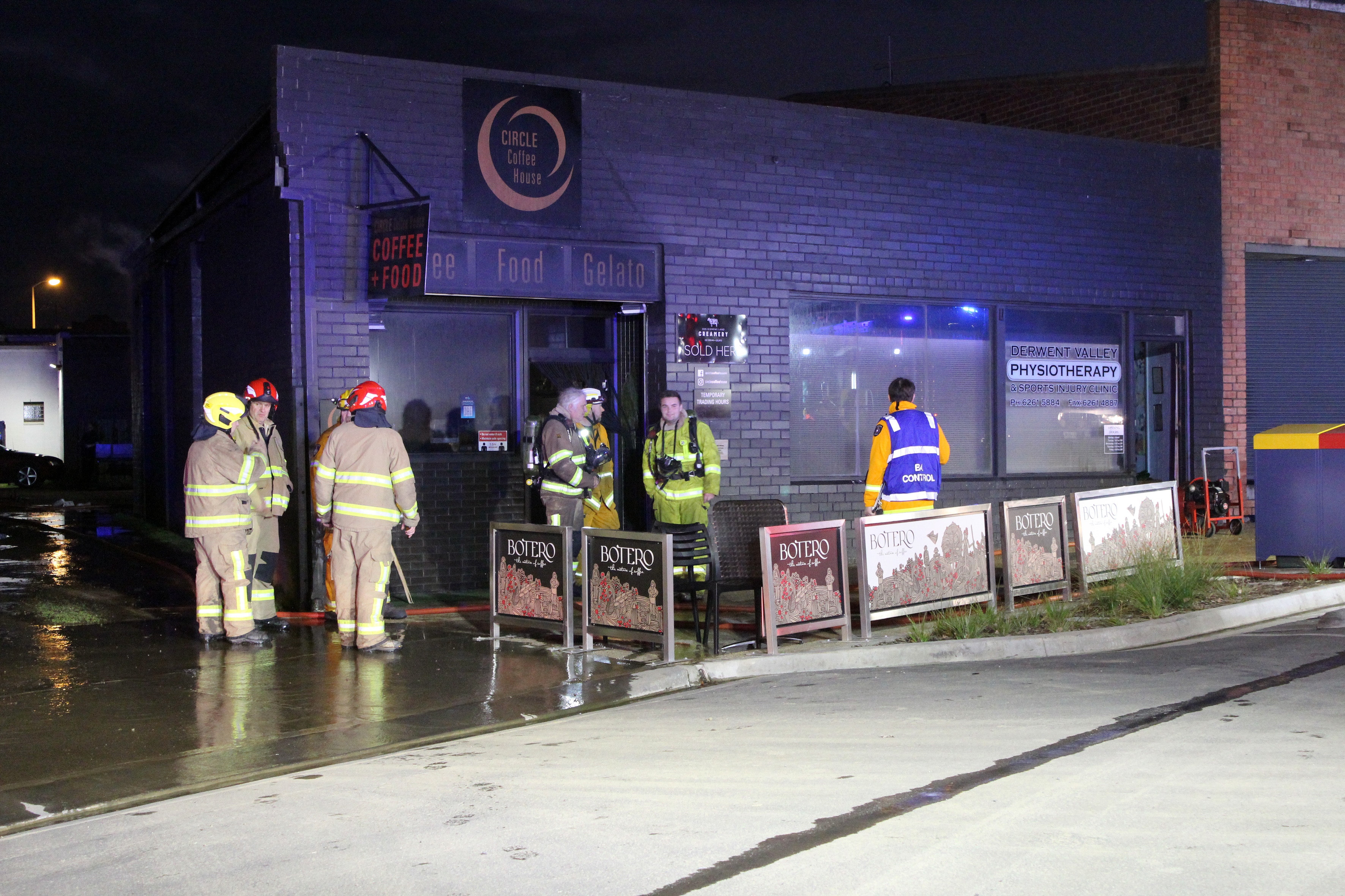 Emergency crews were called to Circle Coffee House in New Norfolk around 5:20pm on Saturday to find the family-run business engulfed in flames.
