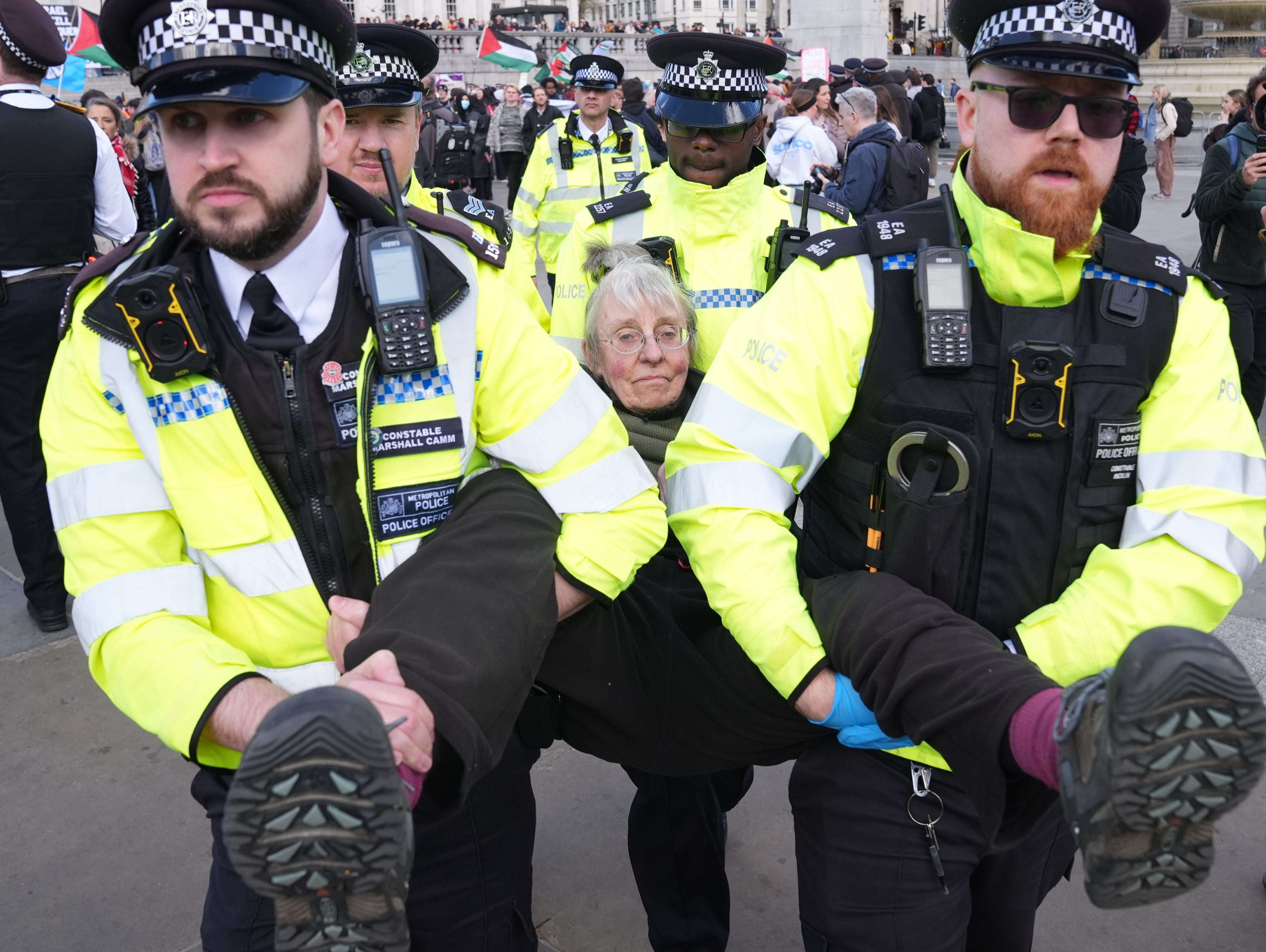 A spokesperson for the Metropolitan Police said officers have so far arrested 92 people and confirmed all of the arrests made during the demonstration at Trafalgar Square are for showing support for a proscribed organisation.
