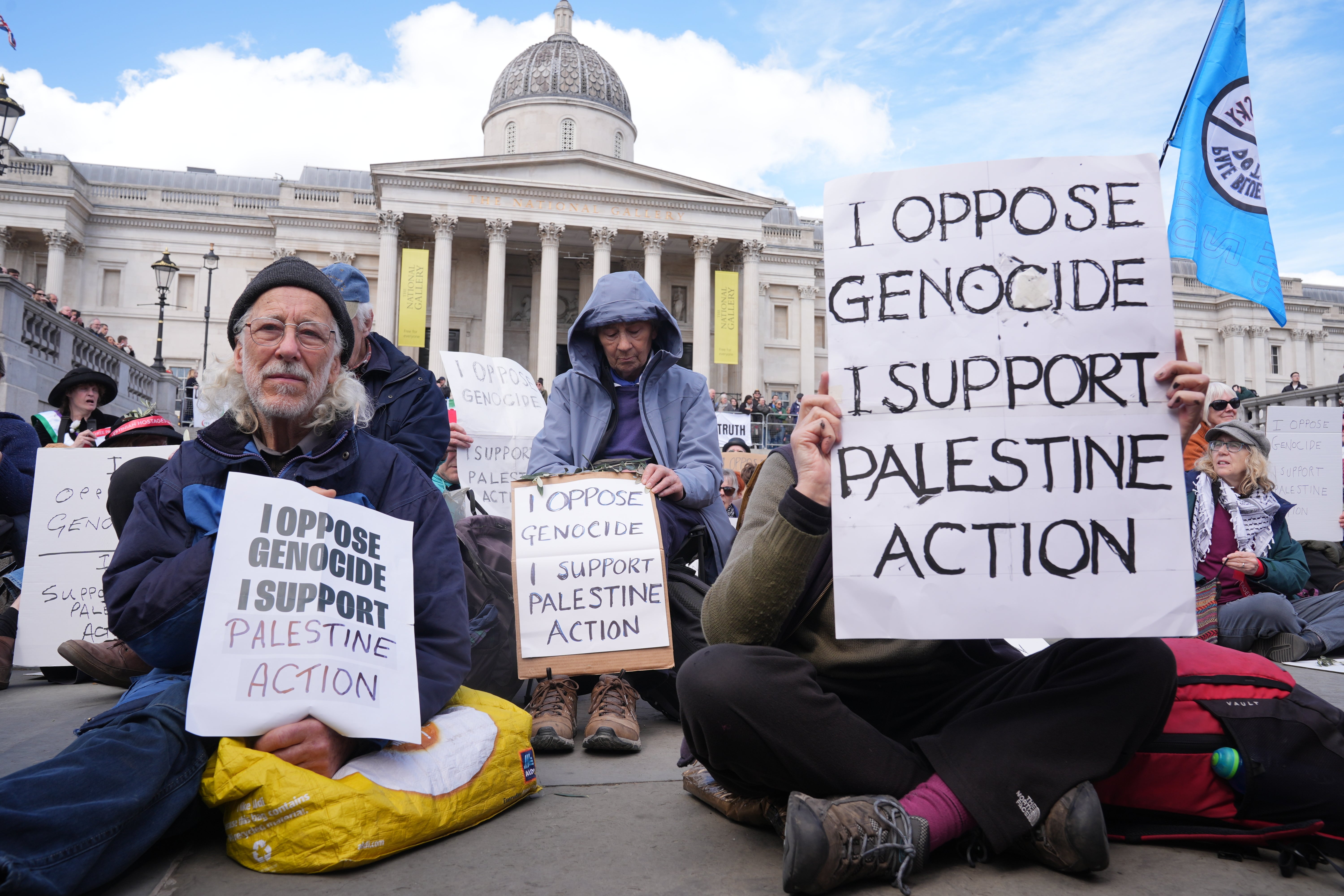 Demonstrators converged on Trafalgar Square, where many sat on camping chairs and on the ground, displaying placards that read: "I oppose genocide. I support Palestine Action."
