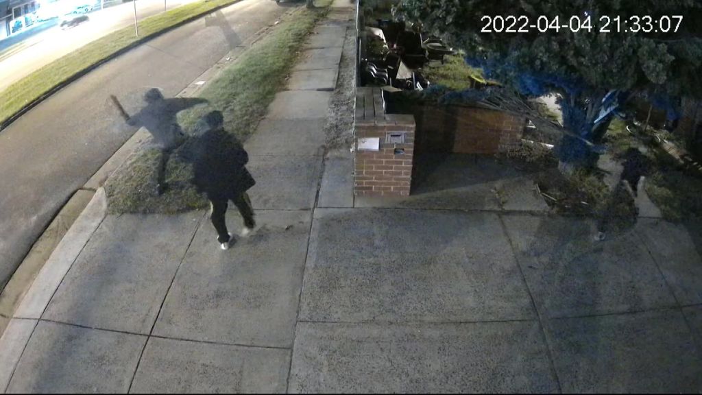 It shows them standing in the driveway of the apartment block, talking in an animated fashion, before one of the men walks towards the units holding a baseball bat and returns back to the street.