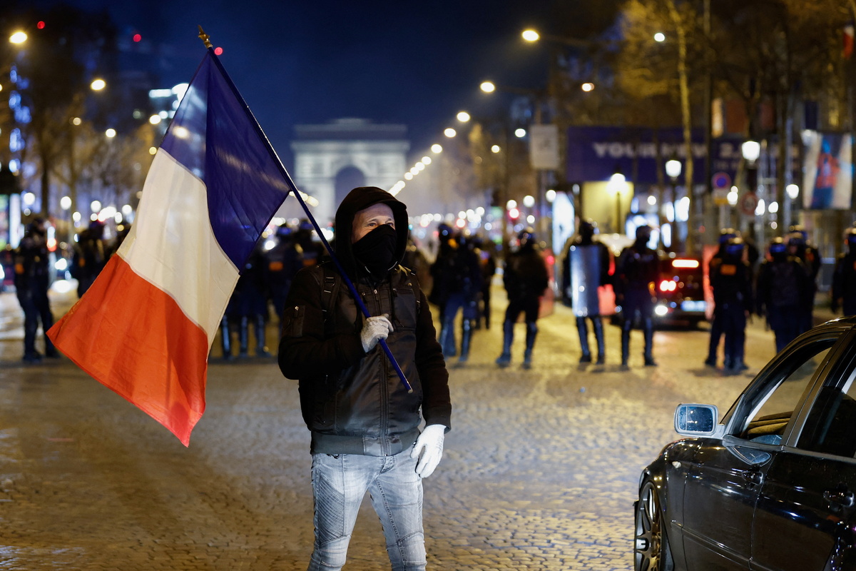 Riot police also threw tear gas grenades to keep order at an authorised street protest where demonstrators, including some "Yellow Vests" railed against President Emmanuel Macron's coronavirus vaccine pass rules and the cost of living.