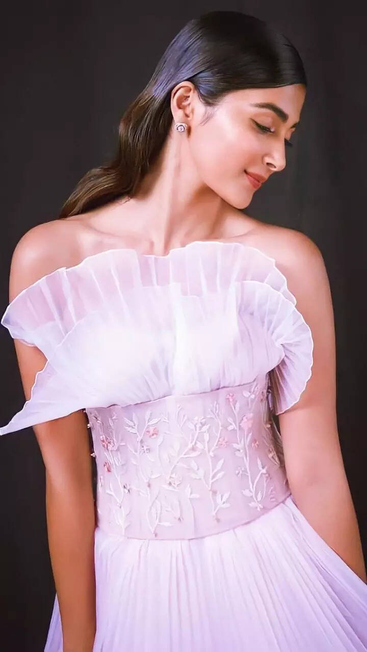 Pooja Hegde looks pretty in the off-shoulder dress.