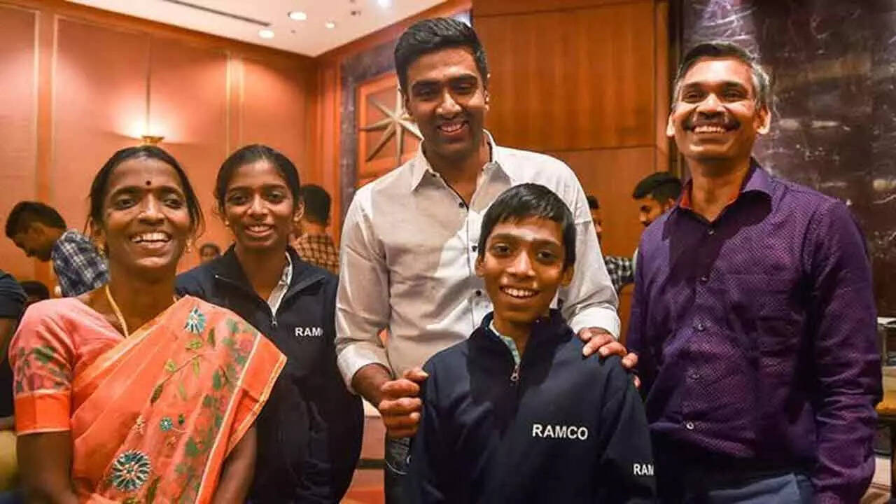 (Praggu with his family and Indian cricketer Ravichandran Ashwin - Photo: @rpragchess Twitter)