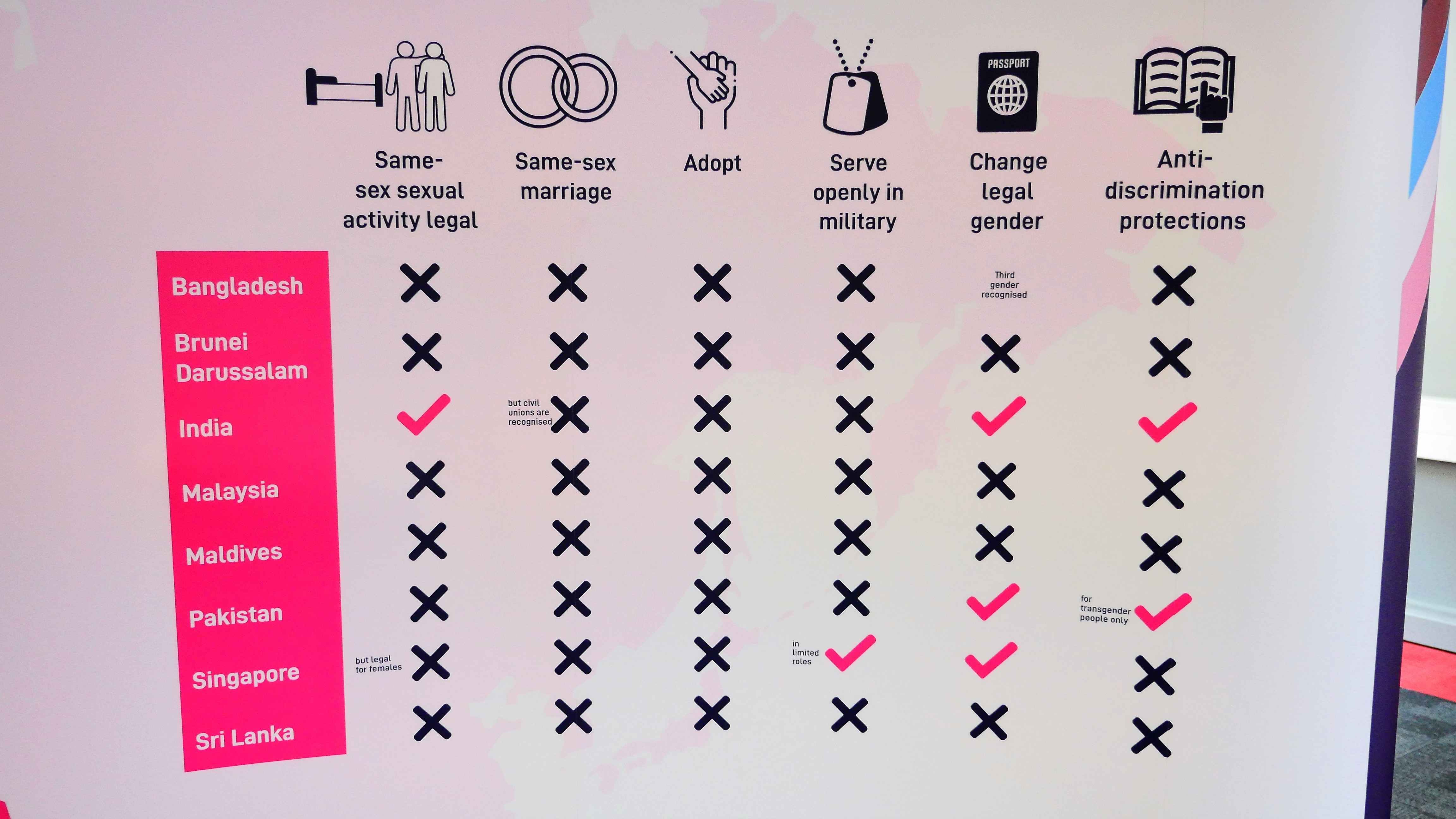 One of the exhibitions provides an overview of the human rights situation for LGBTQI+ people across the Commonwealth's 56 member states, including legality of same-sex sexual activity, marriage laws and whether they have anti-discrimination protections.