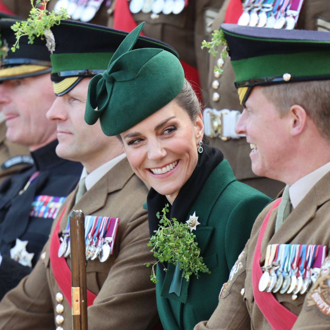 Princess Kate looked festive in shades of green at the annual Irish Guards St. Patrick’s Day parade on Tuesday, March 17, and one piece of her wardrobe was especially appropriate to celebrate all things Irish. Wearing a pair of emerald and diamond Asprey earrings that gave a subtle nod to Prince William, the Princess of Wales sent a hidden message with her $11,375 jewelry.
