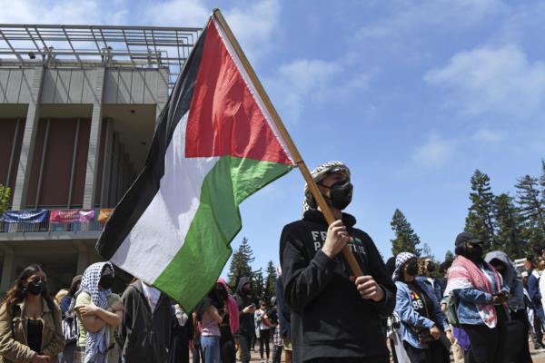 Pro-Palestinian protesters demonstrate outside the main gate at Columbia University, in New York, early Friday, April 26, 2024. (AP Photo/Aaron Morrison)