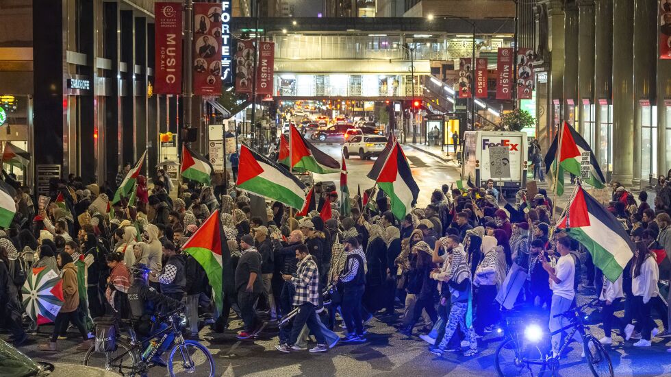 The protest was largely peaceful aside from one incident where tempers flared. As the demonstrators marched through the Loop, someone on the sidewalk tried to grab a Palestinian flag from a protester and then fled inside a building. A group of protesters chased after the man but were unable to enter the building. The situation didn’t escalate further. A small group of protesters burned an Israeli flag away from the main march.