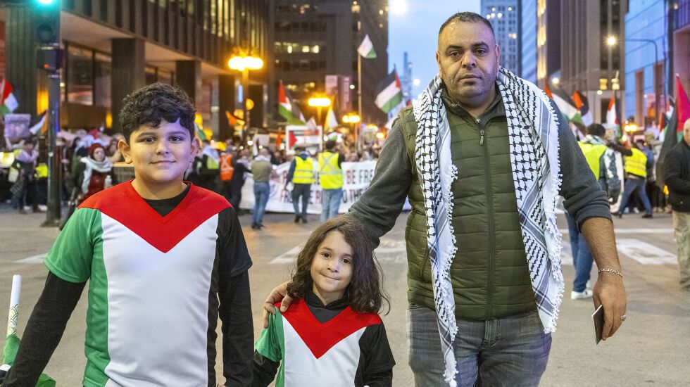 Qendah and two of his children, draped in the colors of the Palestinian flag, joined thousands of others Wednesday at a rally and march in the Loop in support of the Palestinian people. The demonstrators called for the U.S. government to step in and end the bloodshed.