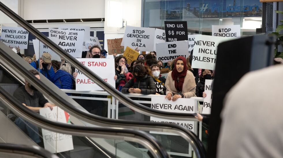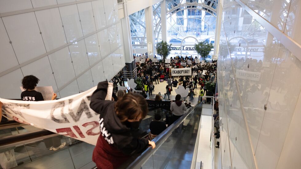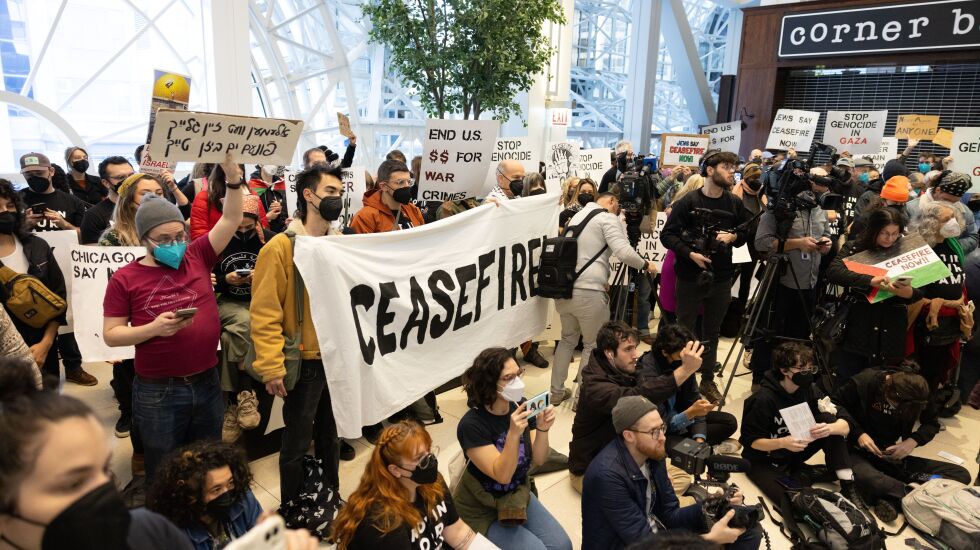 Hundreds of protesters chanting “ceasefire now” blocked escalators to the Israel consulate Monday morning above the Ogilvie Transportation Center.