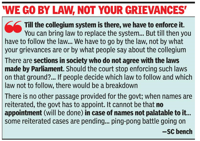 “Till the collegium system is there, we have to enforce it. You can bring law to replace the system and no one is preventing you. But till then you have to follow the law which is existing today and our job is to enforce the law as it stands today... We have to go by the law not by what your grievances are or by what people say about the collegium system... Any law declared by this court is binding on all stakeholders,” the bench said.