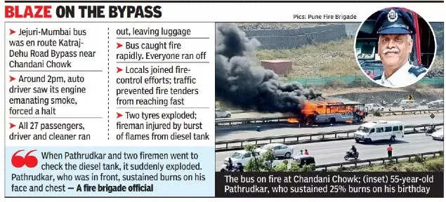 Auto driver Kadam told TOI that around 2pm, just after crossing Chandani Chowk, he noticed sparks in the engine of the private bus heading towards Mumbai. Some two-wheeler drivers also stopped.