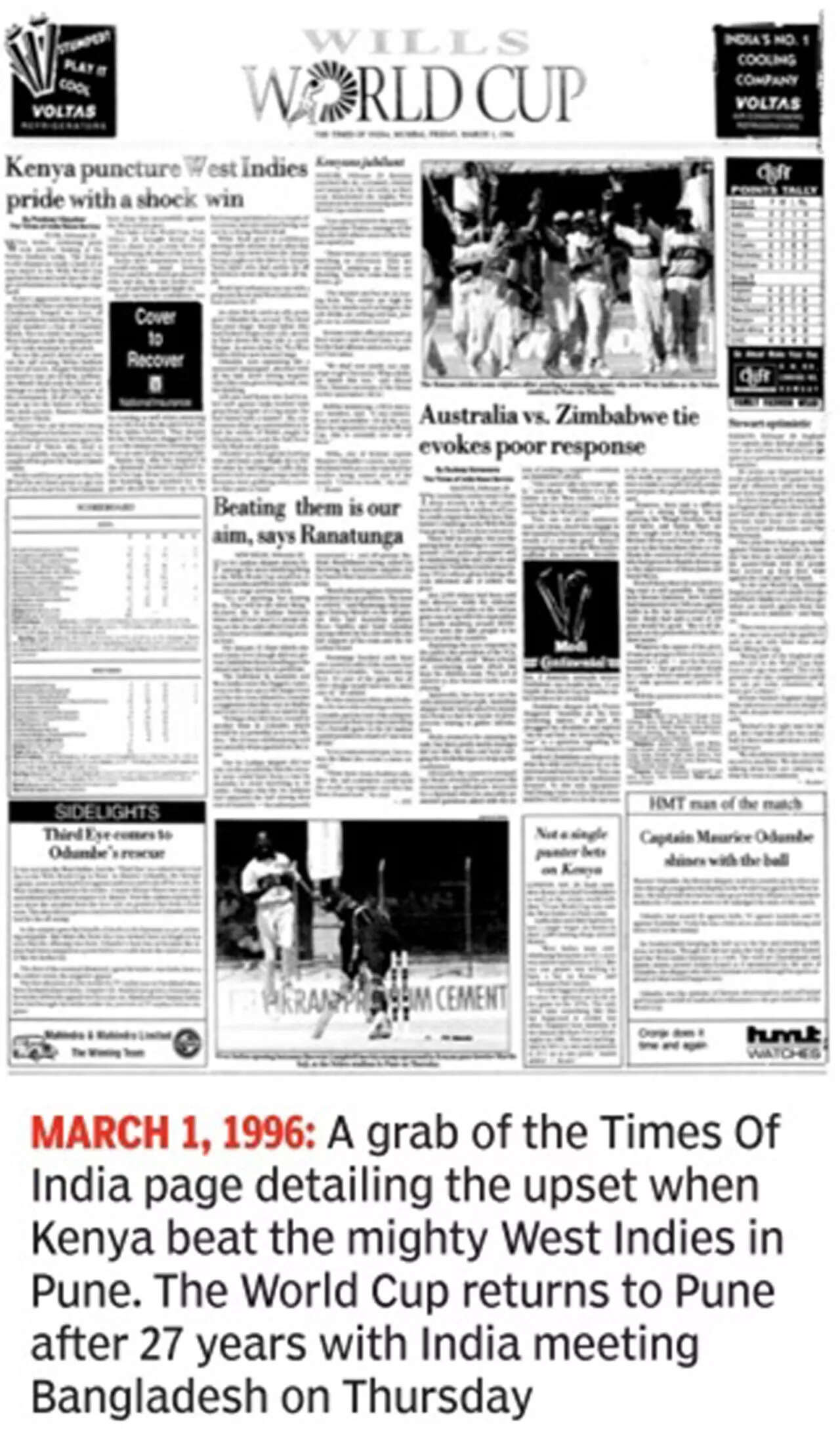 An ODI World Cup generally comes after four years. An associate member beating former world champions - an upset of considerable magnitude - probably comes once in four decades. It needed a leap of faith on a leap year's day - February 29, 1996 - when Maruice Odumbe's Kenya beat the West Indies at Nehru stadium in Pune in the World Cup.