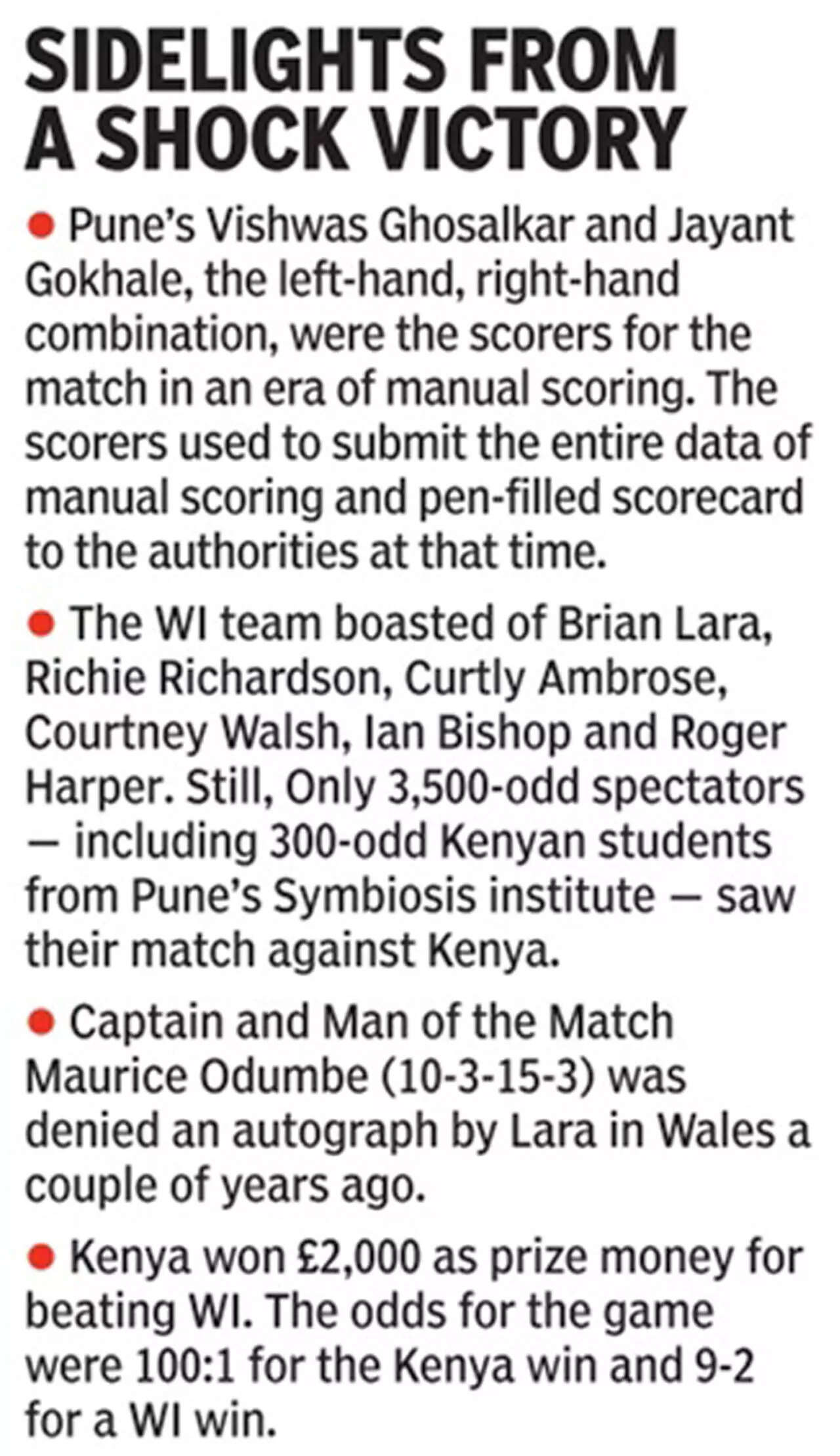 Pune-based Jayant Gokhale, one of the scorers of that match, came face-to-face with Brian Lara, who had overtaken Garry Sobers' then record Test innings score of 365 not out two years ago. Gokhale was also gifted a tie by the Kenyan team. Despite the humiliating defeat and giving a walkover to Sri Lanka, the West Indies reached the semifinals and were denied only in the last over by Australia in Mohali. They have not reached the knockout phase of any ODI World Cup since.