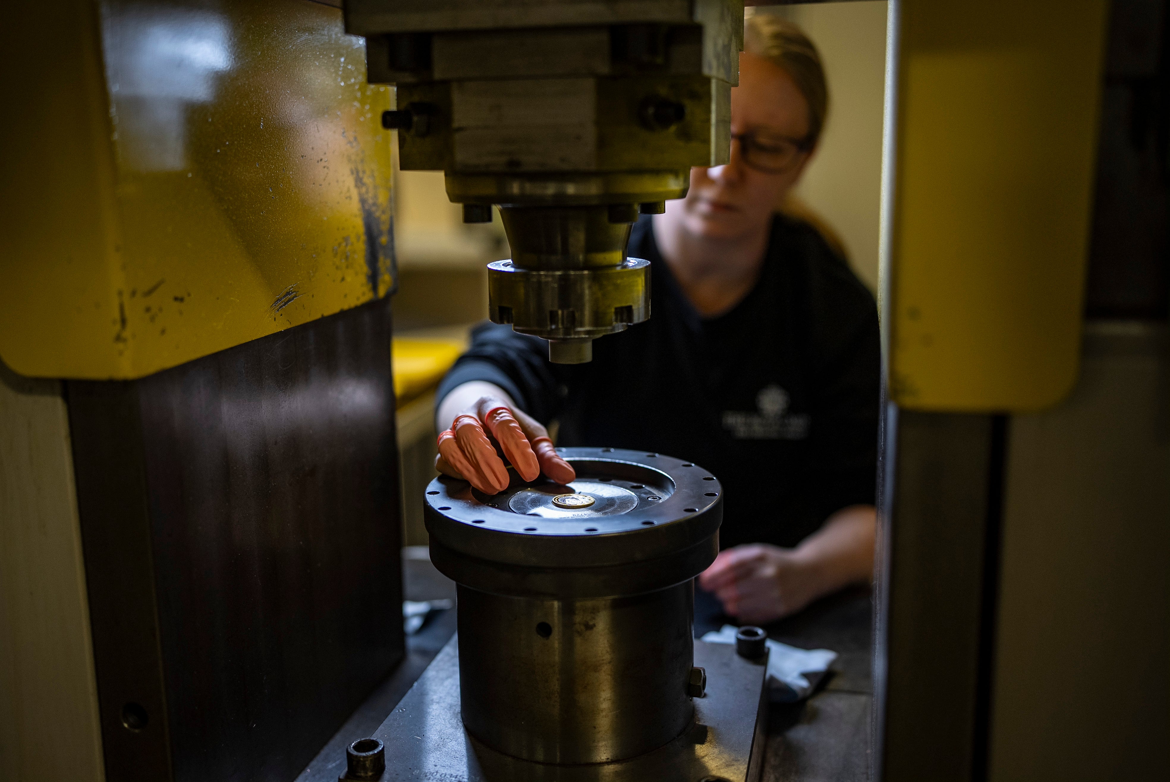 A Royal Mint coin striking operator lifts out a ZSL £2 coin (Ben Birchall/PA Wire)