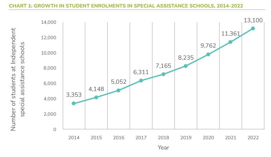 There were 96 independent special assistance schools nationally in 2022, with 13,100 students.