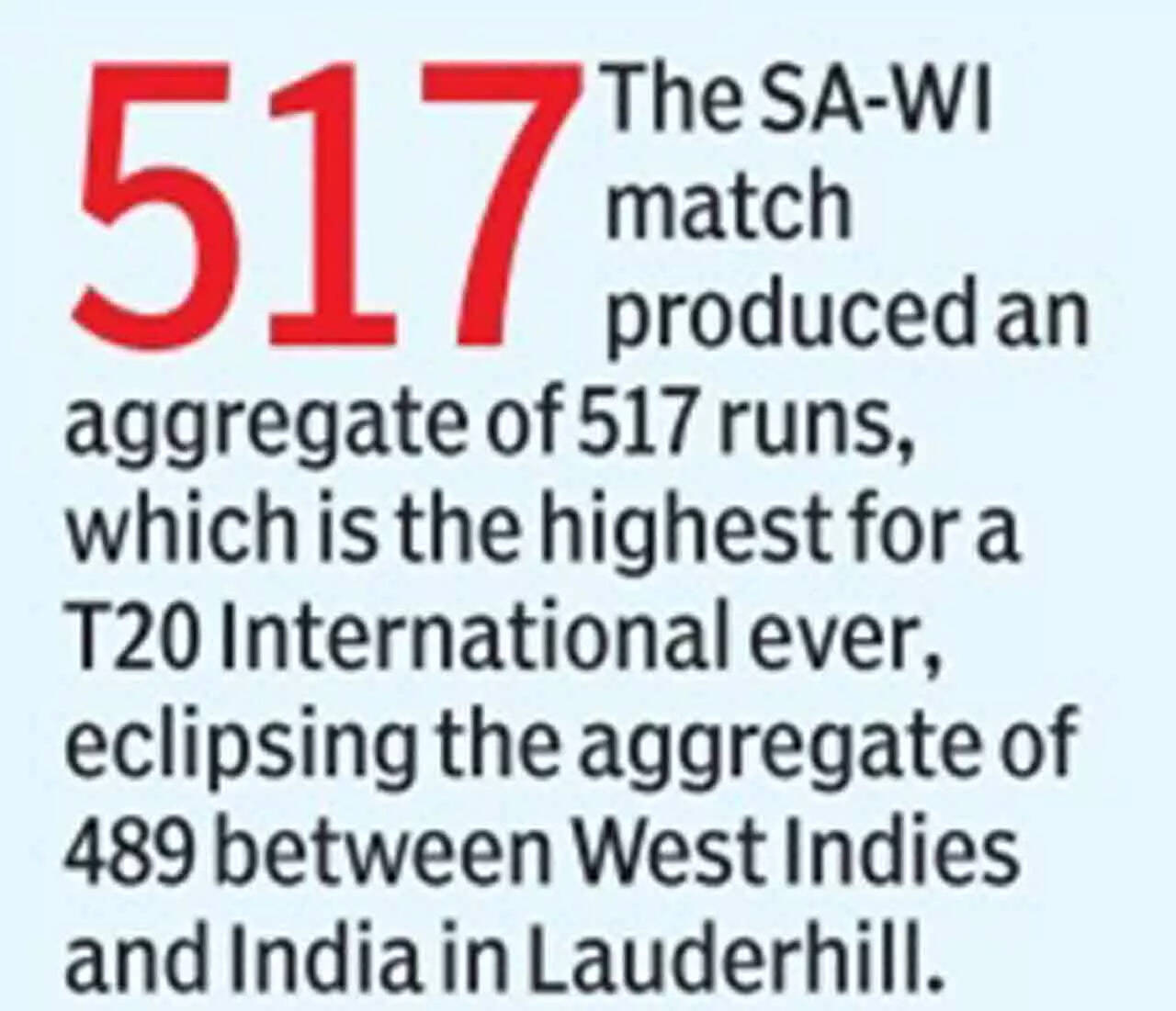 NEW DELHI: The SuperSport Park in Centurion witnessed a batting mayhem as South Africa brushed away West Indies by six wickets to register the highest ever successful run chase in T20Is.
