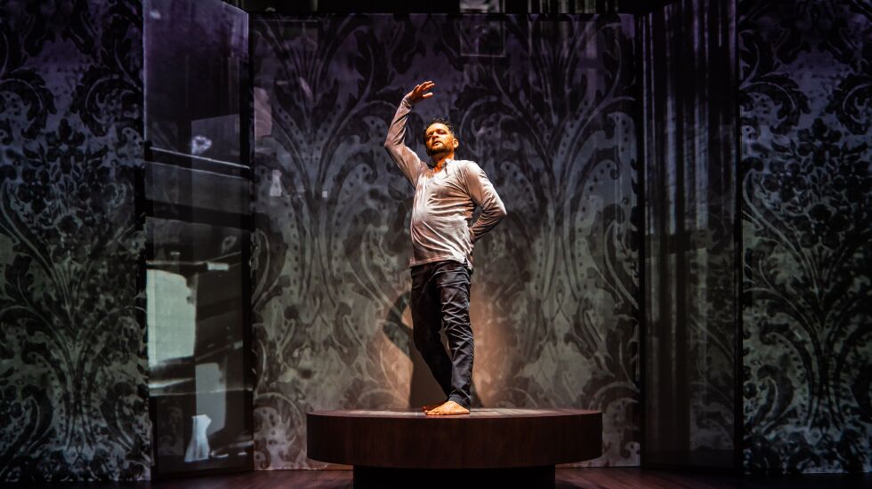 With “Misha” flickering silvery and bright behind him in Jared Mezzocchi’s projection design, Antonio tries to mimic the famed dancer’s seemingly impossible leaps and turns. It’s a breathtaking, kinetic portrait of art imitating life imitating art impacting life.
