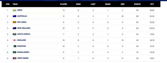 India currently lead the standings with 62.82% of possible points. They have one Test remaining at home against New Zealand and a five-Test series in Australia.