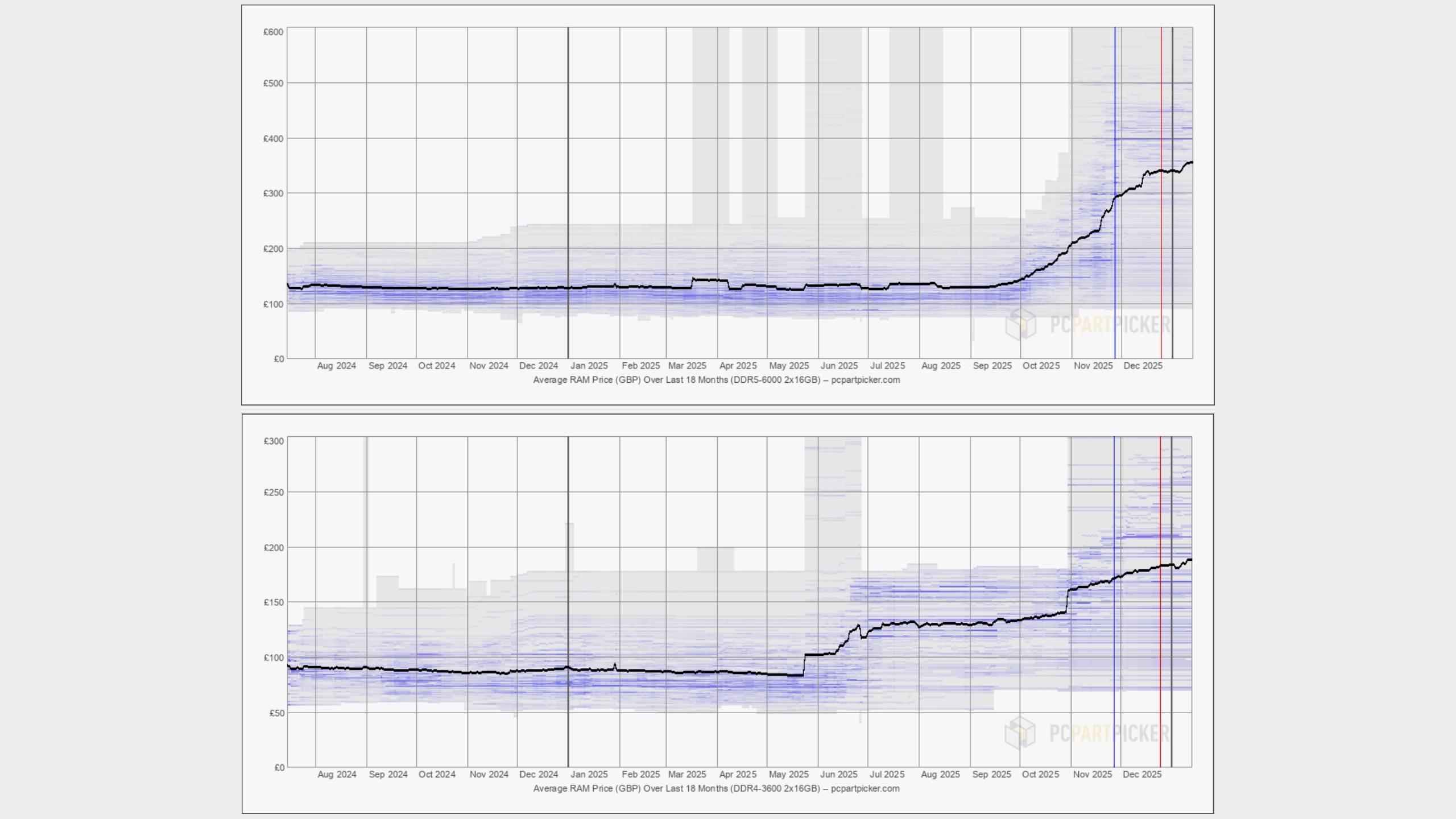 You might have noticed this worrying trend if you've been looking for a RAM upgrade lately. Charts on pcpartpicker.com are telling: since mid-2025, DDR4 and DDR5 consumer memory kit prices have been climbing, with particularly notable spikes for DDR5 memory since September. That's true all the way from DDR4-3200 kits up to DDR5-6000 ones.