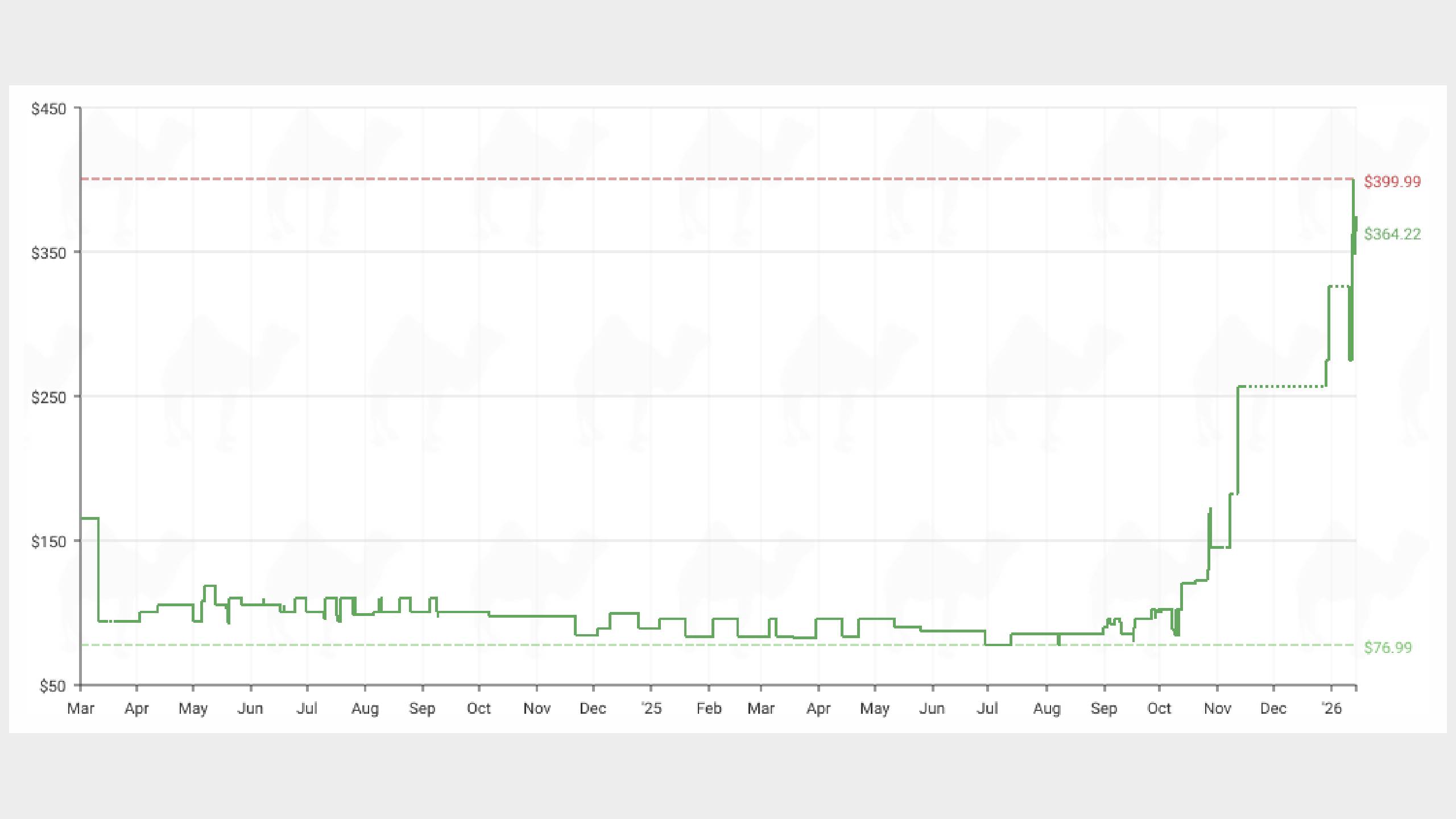 DDR4 isn't safe, either, as this 32 GB Corsair Vengeance DDR4-3200 kit on Amazon shows. It dropped slowly from about $80 to about $50 over the course of 2024, where it remained stable throughout 2025 until the middle of the year. Then, it shot up in price over the second half of 2025 to $200, for a 300% increase to 4x the cost it was at previously.