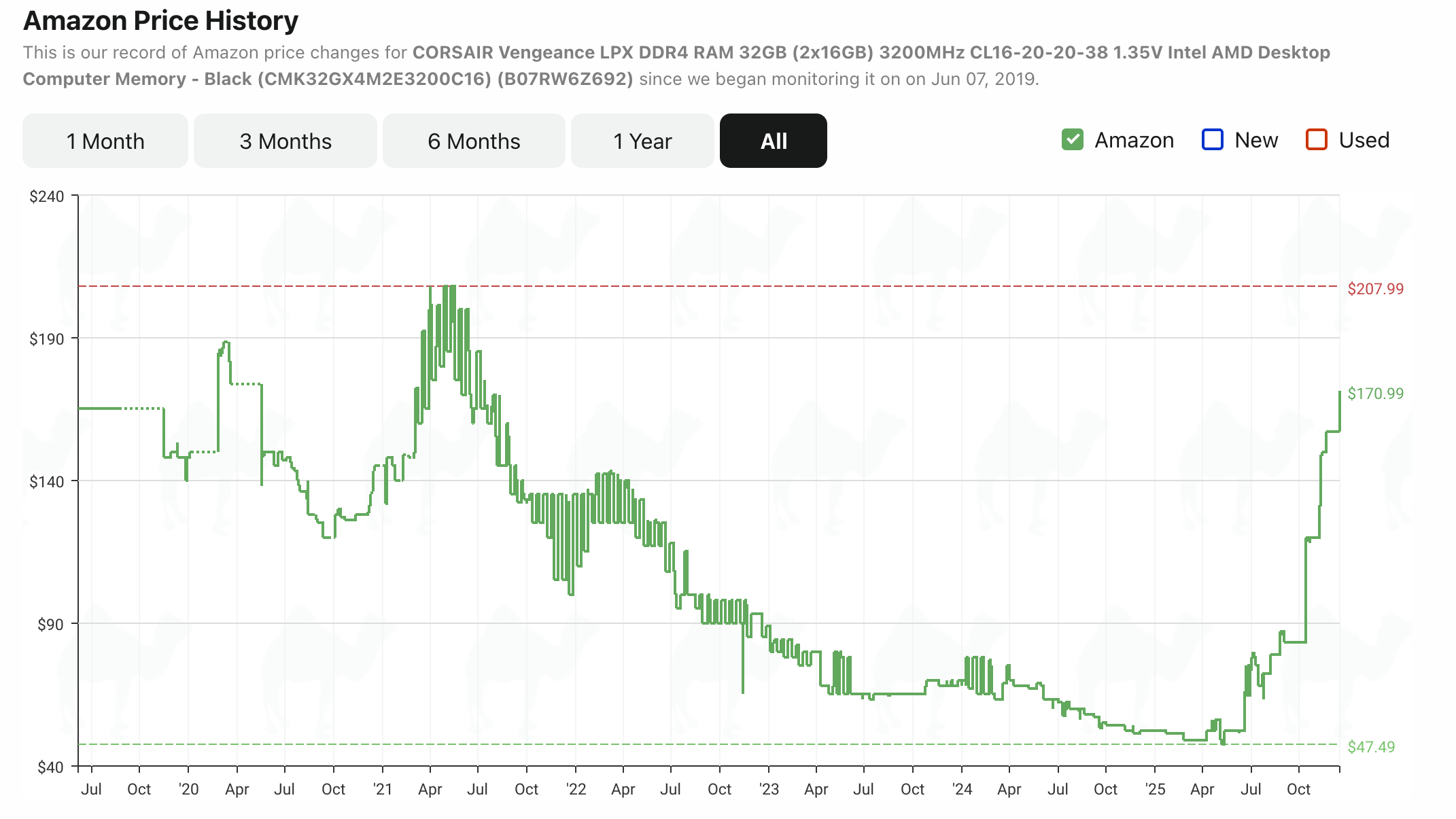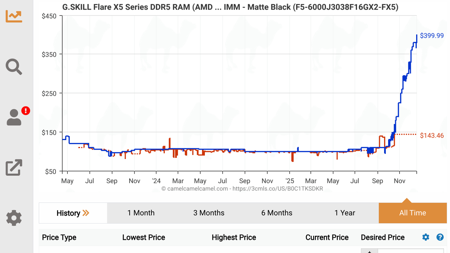 Kicking off with a price check on RAM, and unfortunately, costs continue to climb. You'll find DDR5 RAM sticks like this 32GB G.SKILL Flare X5 reaching $379 at Amazon right now, and using price tracker CamelCamelCamel shows a sharp rise from its usual sub-$150 price point. The price of RAM has effectively doubled in this example.