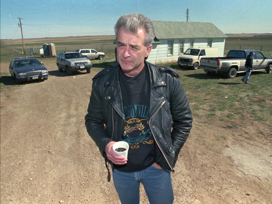 Randy Weaver, the object of the Ruby Ridge siege, visits with the media at the main FBI roadblock outside the Freemen compound in Montana on April 27, 1996. Weaver, who served as a spark for the growth of anti-government extremists, has died at the age of 74. (Jim Mone / AP)