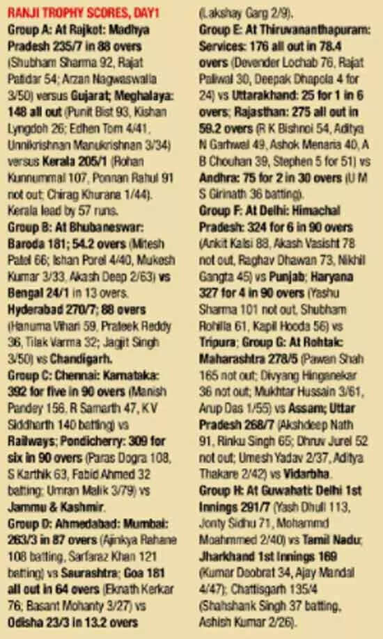 Rescuing Mumbai from a point where Saurashtra looked to be all over them after reducing them to 44 for three, Ajinkya Rahane (108 not out, 250b, 14x4, 2x6) and Sarfaraz Khan slammed superb centuries (121 not out, 219b, 15x4, 2x6), adding 219 for their fourth wicket alliance in 448 balls to take the 41-time champs to 263 for three by stumps. If the first hour was won by Saurashtra, in which their captain Jaydev Unadkat took Mumbai skipper Prithvi Shaw’s scalp, Rahane and Sarfaraz’s magnificent knocks ensured that the day belonged to Mumbai.