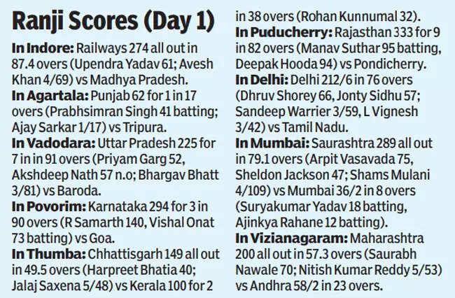 Saurashtra’s joy doubled when medium-pacer Chirag Jani broke the stumps of Jaiswal off the last ball of his first over. Suryakumar Yadav (18 not out, 13b, 4x4) and skipper Ajinkya Rahane (12 not out, 24b, 2x4), who scored a double hundred in the last game here, then calmed the team’s nerves with a flurry of delightful boundaries.