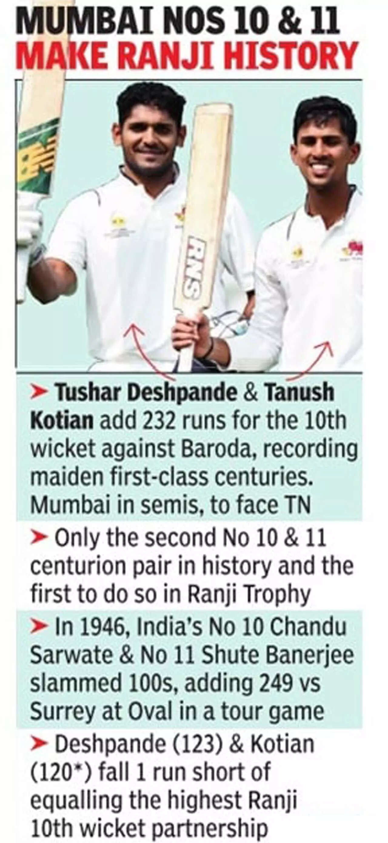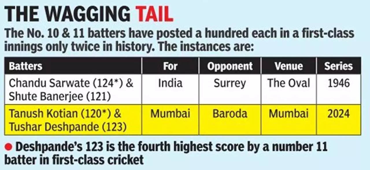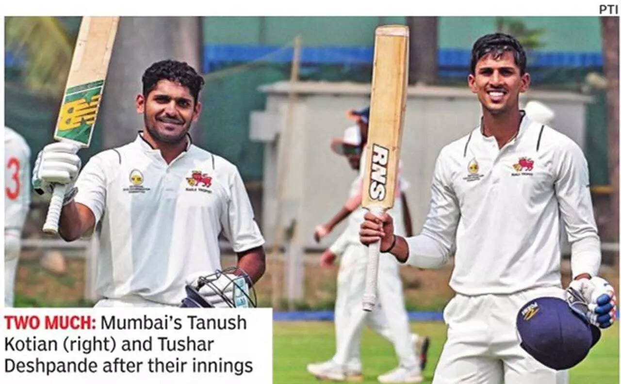Tanush Kotian (120 not out, 129b, 10x4, 2x6) and Tushar Deshpande (123, 129b, 10x6, 8x4) logged the first instance of the No 10 and No 11 batsmen making centuries in the same innings in the Ranji Trophy.