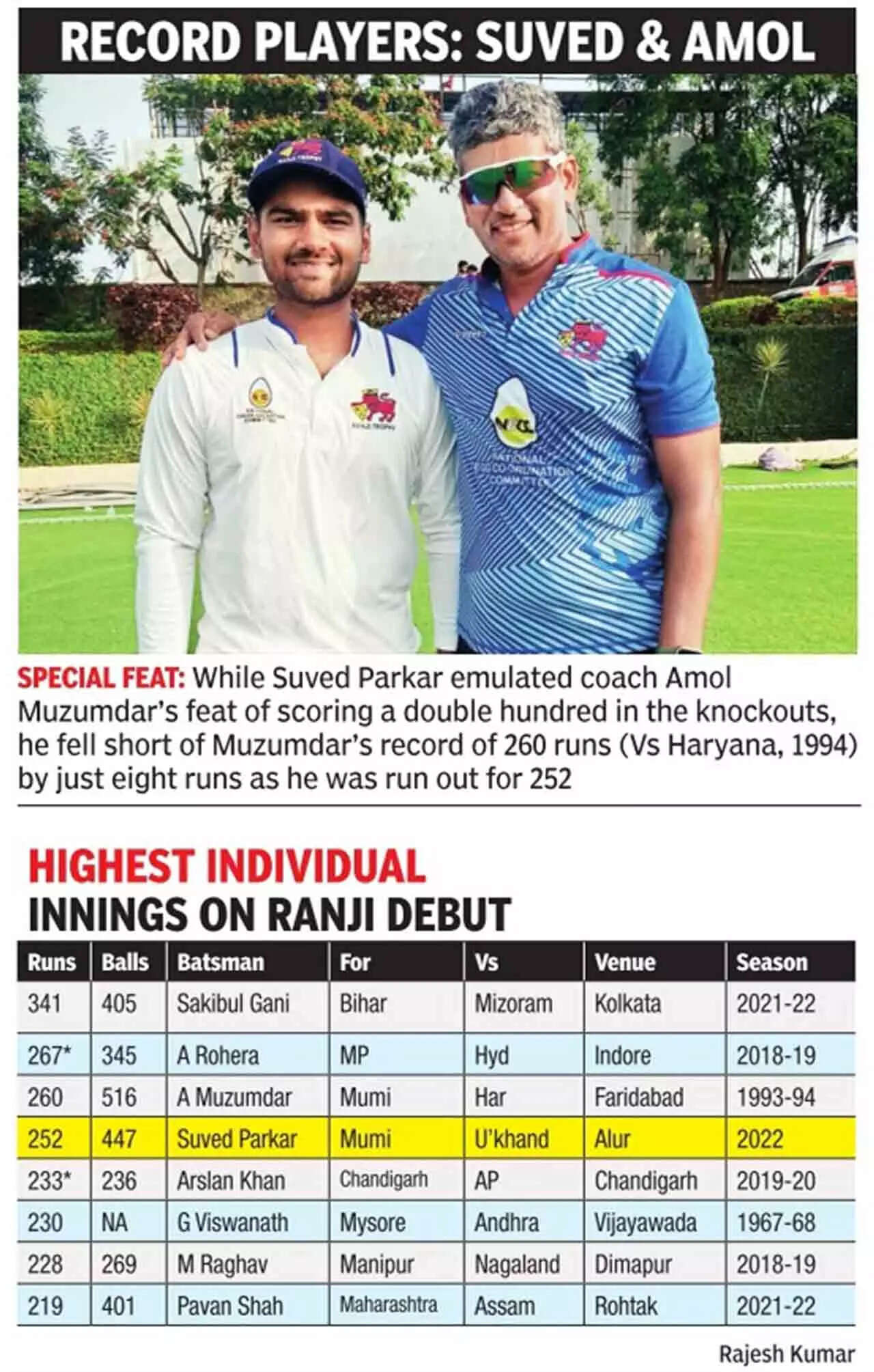 However, the youngster was unlucky to miss out on breaking his coach Amol Muzumdar's record (260 against Haryana in the Ranji Trophy quarterfinal at Faridabad in 1993-94) for the highest score by a debutant for Mumbai in the Ranji Trophy, and by a debutant in the knockouts, by eight runs, when he was run out after cracking a magnificent double hundred (252, 447b, 21x4, 3x6) on Day Two in the Ranji Trophy quarterfinal against Uttarakhand at the Alur Cricket Ground Stadium-2. It is still the fourth highest score by any Indian on debut in First Class cricket.