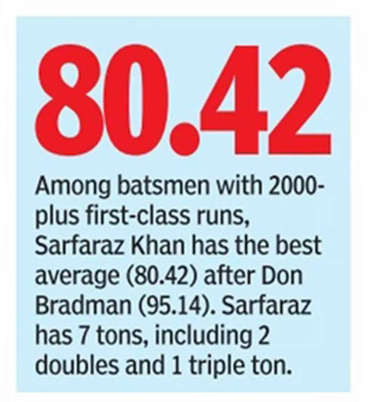 Resuming the day on 69, Sarfaraz reached his seventh First-Class hundred 45 minutes into the morning session, playing an upper cut off Akash Madhwal for a six and then celebrating with a thigh-five a la Shikhar Dhawan. Among batsmen with 2000-plus First-Class runs, Sarfaraz now has the next best average (80. 42) after Don Bradman. Besides seven hundreds, he has two double hundreds, one triple hundred and two 150-plus scores in his bag.