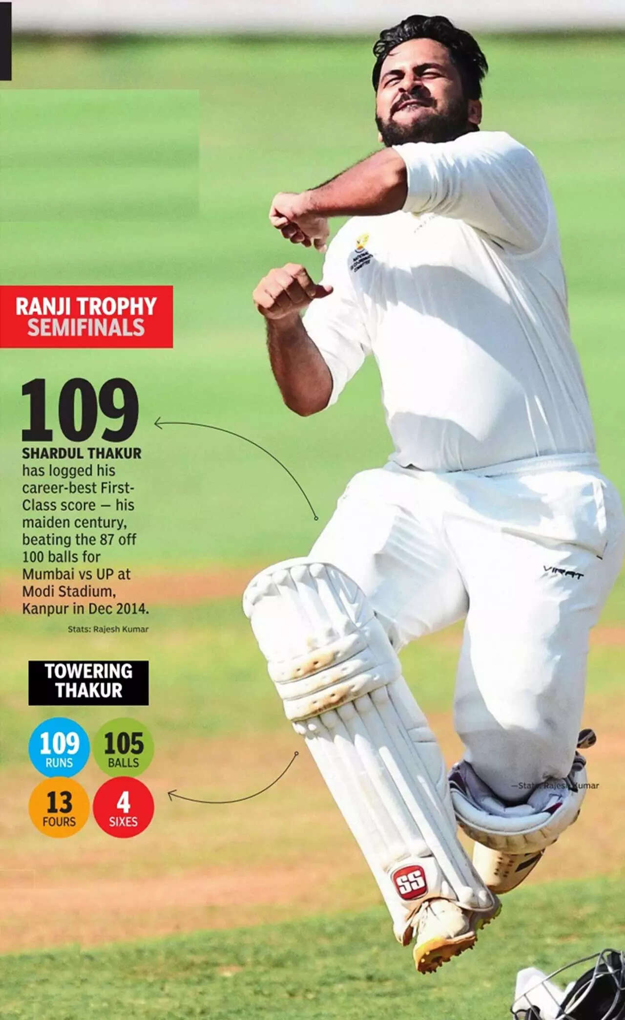 MUMBAI: It was a moment which told you what the Ranji Trophy still means to a lot of India's top cricketers. Moments after he danced down the track to deposit Tamil Nadu left-arm spinner Ajith Ram over long-off for a six to reach his maiden First-Class century (109, 105b, 13x4, 4x6), which took him just 89 balls, Shardul Thakur indulged in a unique celebration.