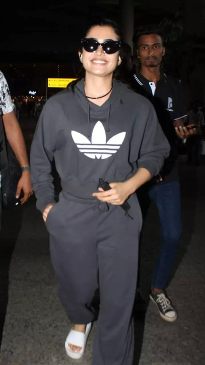 The \'Varisu\' actress was recently spotted at the Mumbai airport all decked up in a monochrome white ensemble.
