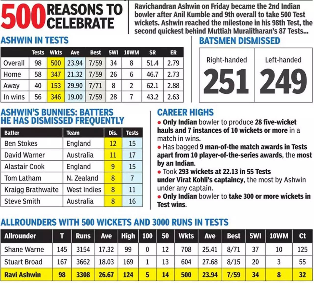 Sharing his thoughts on Ashwin's unique milestone, Swann, who took 255 Test wickets @29.96, told the reporters here, "It was going to come in this Test match, probably fitting that it was the first wicket to fall. Just when India needed that breakthrough, he is the man who got it. I have got to take my hat off to him. It is brilliant to see, especially a finger spinner to get to 500 Test wickets. I have always been a huge fan of his bowling. To get to 500 Test wickets in less than 100 Tests is a massive thing."