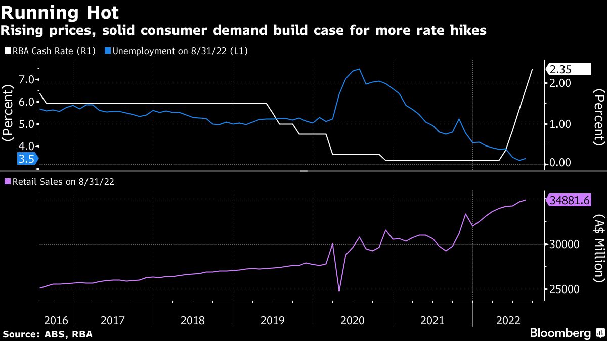 Most economists surveyed by Bloomberg see a fifth straight half percentage-point hike by the Reserve Bank on Oct. 4 to take the cash rate to 2.85%, before opting for smaller hikes going ahead. Money markets have a similar base case. That’s the latest take on recent signals from Governor Philip Lowe that he is keen to downshift to quarter-point moves at some point.